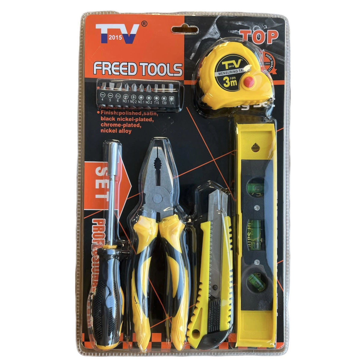 • 15-в-1 комплект с отвертка, нивелир, клещи и ролетка