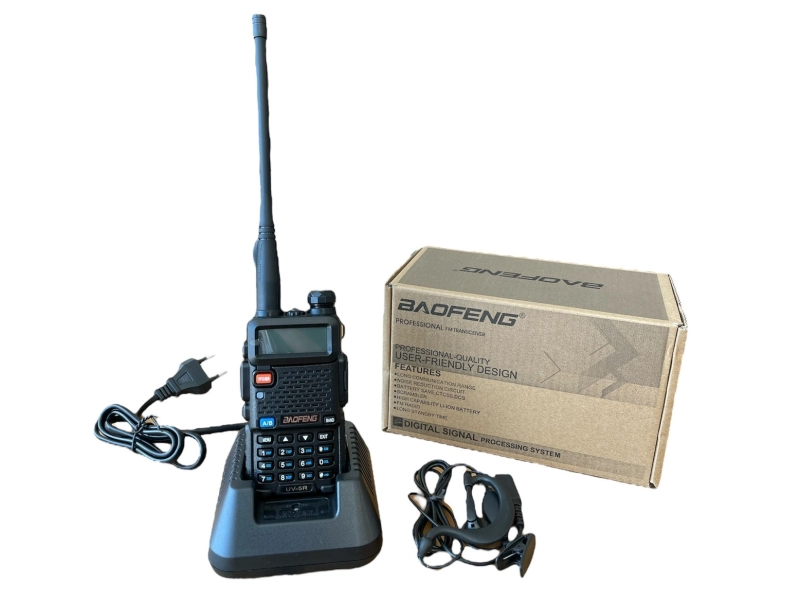 Мощна радиостанция Baofeng UV-5R 8W с VHF-UHF честоти ще покрие обхват до 10 км в идеални условия. Високите (136 – 174MHz) и ултрависоките (400 – 480MHz) честоти ще Ви осигурят надеждна комуникация, независимо дали се намирате в гъста гора или в закрито помещение. Можете да изберете до 128 канала и да програмирате радиостанцията, чрез компютър или ръчно. Имате възможност да изберете изходящата мощност в зависимост от това, какъв периметър искате да обхванете. Ако групата е наблизо може да изберете по-ниска мощност, с което ще спестите енергия. В икономичен режим батерията издържа до 24 часа. За по-голяма сигурност на комуникацията може да кодирате каналите. Има DTMF кодиране, което позволява да изпратите съобщение на конкретен приемник без останалите в групата да чуят. Разполагате с двуредов дисплей с подсветка, а под него има удобни бутони, които могат да се заключат, за да се предотврати случайно натискане. С този модел можете да уловите радио, чрез което да получите полезна информация при бедствия и аварии.За всеки случай е добавено и удобно LED фенерче, което да освети теренаХарактеристики:- Честотен обхват: 136-174 / 400-480MHz- Изходяща мощност: 8 Вата- Брой канали: 128 (50 CTCSS и 104 CDCSS)- Вградена VOX функция: да- FM радио честотен обхват (65.0MHz-108.0MHz)- LED фенер: да- Голям LCD дисплей: да,- Превключване между Високи и Ниски радио честоти 25KHz/12.5KHz- SOS аларма: да- Аларма за ниско ниво на заряда на батерията: да- Функция за пестене на енергията: да- Обхват на действие 1-4 км.- Таймер: даЗаключване на клавиатурата: даСлушане на определен канал: даСтъпка за всеки следващ канал: 2.5/5/6.25/10/12.5/25KHzКомплекта включва:2 x UV-5R радиостанция (VHF136-174Mhz UHF400-480Mhz)2 x 7.4V 3800mah Li-ion презареждаема батерия2 x Антена 136-174/400-470Mhz2 x Щипка за колан2 x упътване2 x Настолно зарядно ( 100V ~ 240V )2 x PTT слушалка с микрофон тип хендсфри