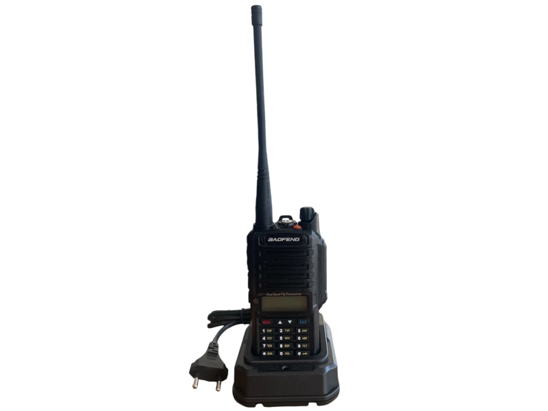 Baofeng UV-9R е мощна радиостанция с отличен звук. Вграденият микрофон е високочувствителен, което означава че изпратеният сигнал е с максимално добро качество. Говорителите също са изработени по нова технология така, че получените съобщения да са без глъхнене, смущения и страничен шум. Отделно е предвидена солидна защита за аудио мембраните, която ги предпазва при влажно и мокро време.Моделът идва в комплект с двубандова антена и батерия с капацитет 8000mAh. С един пълен заряд ще може да разчитате на около 12 часа интензивна работа. След това ще трябва да презаредите в настолното зарядно, което също е част от комплекта. Предвидена е възможност да зареждате само батерията и по този начин, ако имате резервна, да продължите да ползвате станцията за комуникация.Самият корпус е изработен от здрава пластмаса. В предната му лицева част са разположени двуредов LCD екран и клавиши. Дисплеят показва всички активирани функции плюс настроените канали и честоти, на които говорите. С клавишите можете да правите различни настройки в менюто на устройството, включително да настройвате желана честота.Обхватът е забележителен - 8-10 км в гора или пресечена местностВ горната част на станцията, непосредствено до антената е разположен фенер. Той се активира от отделен бутон встрани на уоки-токито. Има два режима на светлина, съответно постоянна и премигваща, която се използва най-вече в аварийни ситуации за отбелязване на местоположение или близка опасност.С оранжевото малко копче до фенера може да изпратите SOS сигнал на канала, който е избран за комуникация. Това отново е предназначено за бедствия и аварии, когато човек има нужда от спешна помощ. Последният бутон в редицата е за включване и изключване на станцията и регулиране на силата на звука.В лявата част на корпуса е разположен PTT бутона, с който изпращате сигнал. Той трябва да е постоянно натиснат, докато говорите и да бъде пуснат, когато съобщението завърши и трябва да бъде изпратено. Отново тази функцията е предназначена главно за ситуации на бедствия, когато липсва мобилен сигнал и няма как по друг начин да се информирате за последните събития. При задържане на същото копче се активира звукова аларма, придружена с премигваща светлина от фенера.В дясната страна на корпуса е предвиден конектор за програмиращ кабел, слушалка или трубка говорител. Изходът е защитен с капаче, което е здраво затегнато с винт към корпуса. По този начин станцията става водоустойчива.Важна характеристика е богатото на функции и възможности меню. То позволява да превключвате между висока, средна и ниска предавателна мощност в зависимост от конкретната ситуация и дистанцията, която трябва да се покрие. Предвидена е функция за гласова активация и заключване на клавишите, режим за пестене на батерията и още много други, които може да видите изредени по-долу в описанието.Технически характеристики:Честотен обхват: 136-174/400-520MHz;Брой канали: 128 (50 CTCSS и 104 CDCSS); Канален интервал: 25KHz/12.5KHz;Работно напрежение 7.4V DC ± 15%;Стабилност на честотата ± 2,5ppm;Батерия: 8000mAh;Съвместим с американския военен стандарт (Mil-STD-810C / D / E);Трансмитер (EIA-RS 316B STANDARD);RF изходна мощност 10W;Модулация Чувствителност;водоустойчивост: IP67;Двойна лента, двоен дисплей и двоен режим на готовност;Превключване между висока и ниска мощност;Функция VOX;Избор на широк/тесен диапазон;Авт