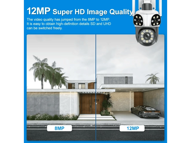 Представяме ви модерна тройна външна WiFi камера, която осигурява кристално ясно видеонаблюдение с 12 MP висока резолюция, 10x ZOOM и интелигентно проследяване на движение. Подходяща за дома, офиса, двора или търговски обекти, тя гарантира перфектна видимост при всякакви условия!
