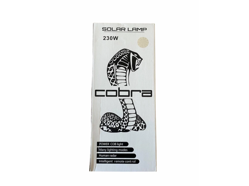 Пакет 3бр. Улична Соларна Водоустойчива лампа Cobra от ново поколение! Системата е изцяло автономна, през светлата част на деня се зарежда батерията, а веднага след като се стъмни осветлението се включва автоматично, благодарение на сензорите за светлина, които са в соларния панел. Соларната улична лампа е интелигентна система за външно осветление, която интегрира най-добрите енергоспестяващи части – фотоволтаичен панел, осветително тяло, сензор, контролер и литиева батерия, всичко това в една кутия. През деня високоефективният слънчев панел събира енергия от слънцето и я съхранява в усъвършенстваната литиева батерия. През нощта мощният светодиод автоматично ще се включи, за да осигури светлина. Опция за светене когато се установи движение, COB ще увеличи яркостта, за да осигури изобилие от допълнително осветление за всеки в района.