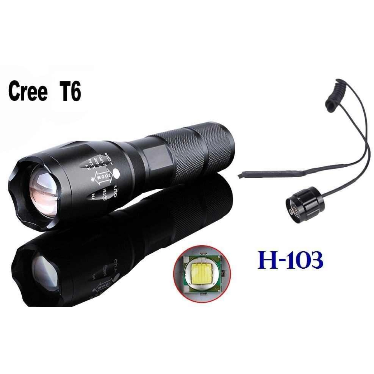 Мощен LED фенер H-103 за риболов и ловни занимания LED фенер H-103 е надеждно и практично осветително устройство, специално създадено за нуждите на риболовци и ловци. С високата си яркост и здрав алуминиев корпус, този фенер предлага дълготрайна и ефективна светлина при всякакви условия на открито. Основни характеристики на LED фенер H-103 Използва мощен Cree T6 LED диод с живот над 100 000 часа, осигуряващ стабилна и ярка светлина. Яркост от 800 лумена, подходяща за осветяване на големи площи през нощта или в слабо осветени места. Алуминиев корпус, който е устойчив на удари и осигурява дълготрайна защита на фенера. Влагозащитен дизайн с капачка и дистанционен бутон за удобно включване и изключване. Регулируем фокус (ZOOM) за насочване на светлинния лъч според нуждите на потребителя. Захранване от акумулаторна батерия 3.7V тип 18650, включена в комплекта, както и възможност за работа с 3 батерии тип ААА. Включено зарядно устройство за 220V мрежа, което осигурява бързо и лесно презареждане. Лек и компактен - тежи само 155 грама, подходящ за носене при всякакви outdoor активности. Защо да изберете LED фенер H-103 за риболов и лов Този LED фенер за риболов и ловни дейности е създаден да предложи максимална ефективност и удобство при работа на тъмно. С мощната си светлина и регулируемия фокус, фенерът позволява прецизно осветяване на целта, което е особено важно при нощен лов или риболов. Здравият корпус и влагозащитата гарантират надеждност дори при неблагоприятни атмосферни условия. Компактният размер и лекото тегло го правят перфектен спътник за всяко приключение в природата. Поръчайте сега LED фенер H-103 и се уверете в качеството и издръжливостта на вашето осветление за лов и риболов!