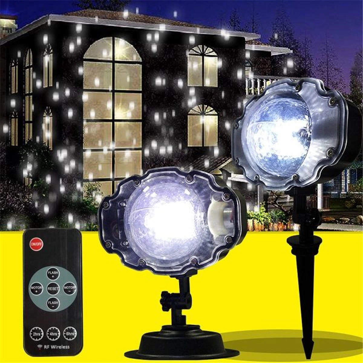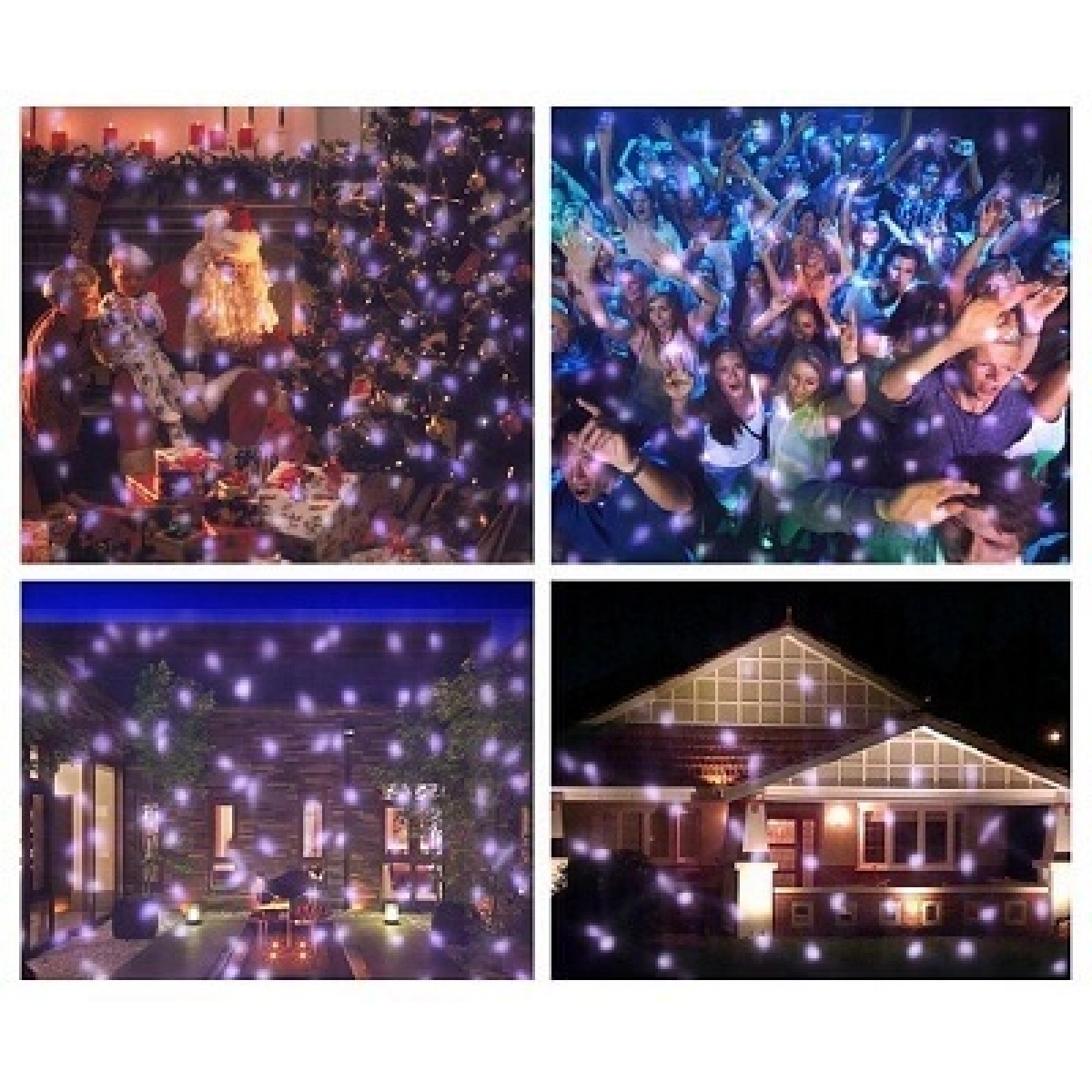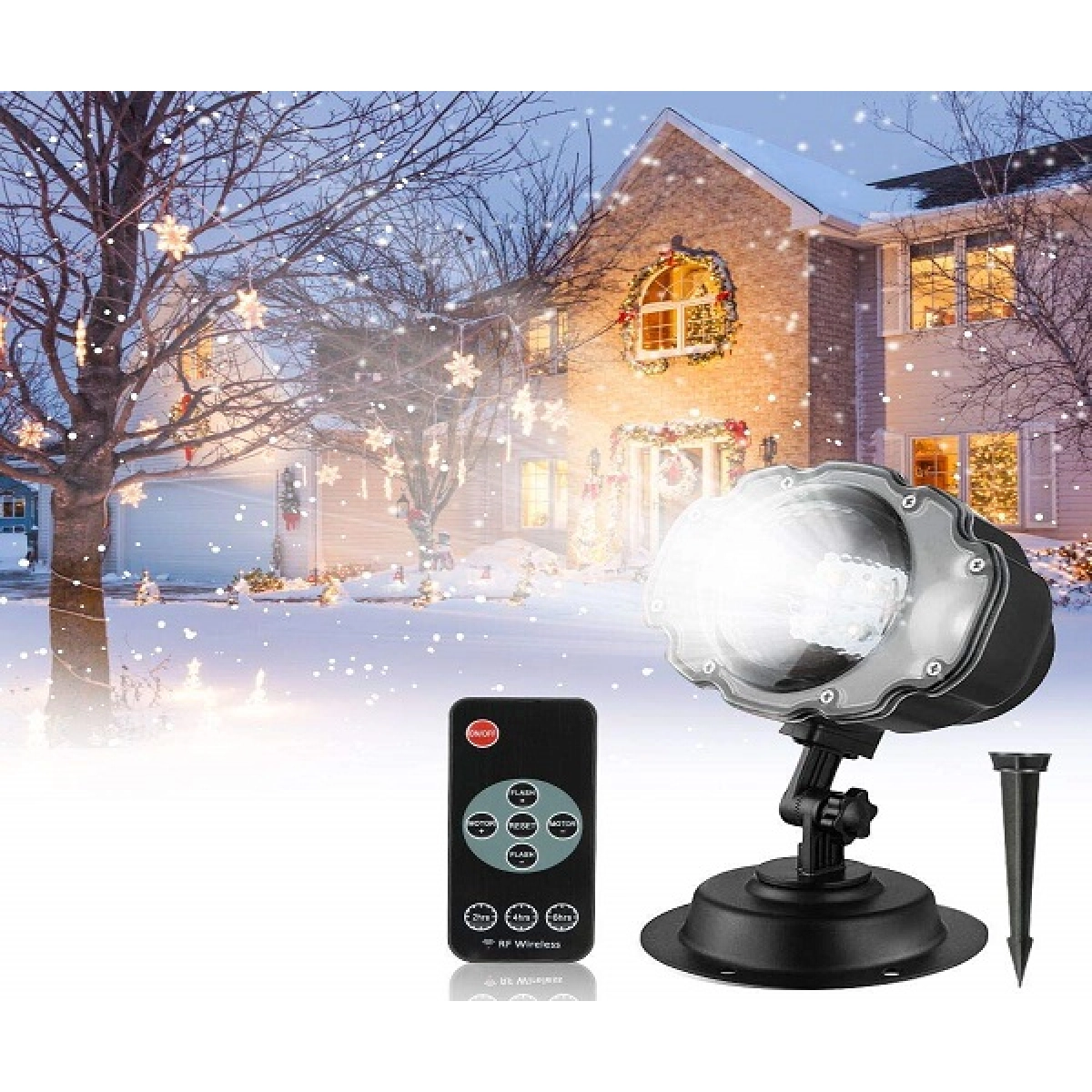 Основният ефект е прожектиране на снежинки, което създава празнична и декоративна атмосфера.