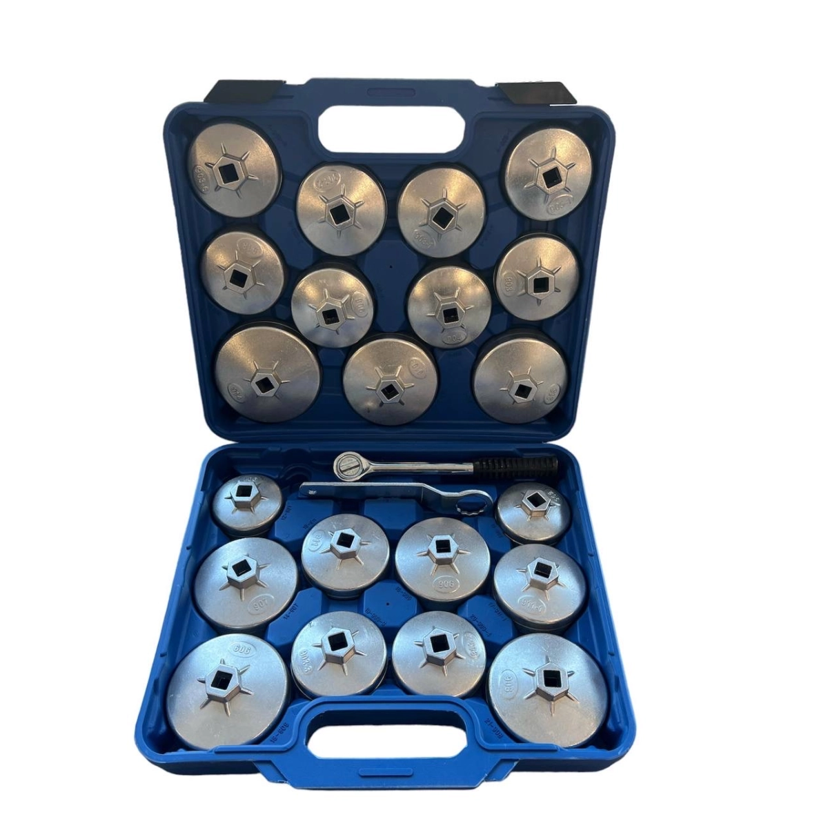 - 23 различни чашкови ключа с разнообразни размери, подходящи за множество модели автомобили.