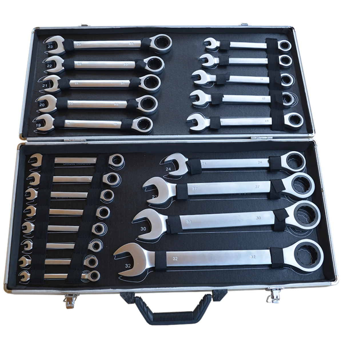 Професионален комплект звездогаечни тресчотни ключове 6-32 мм в метален куфар KraftRoyal