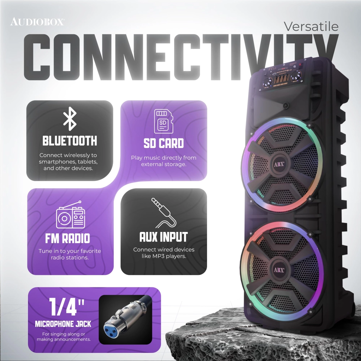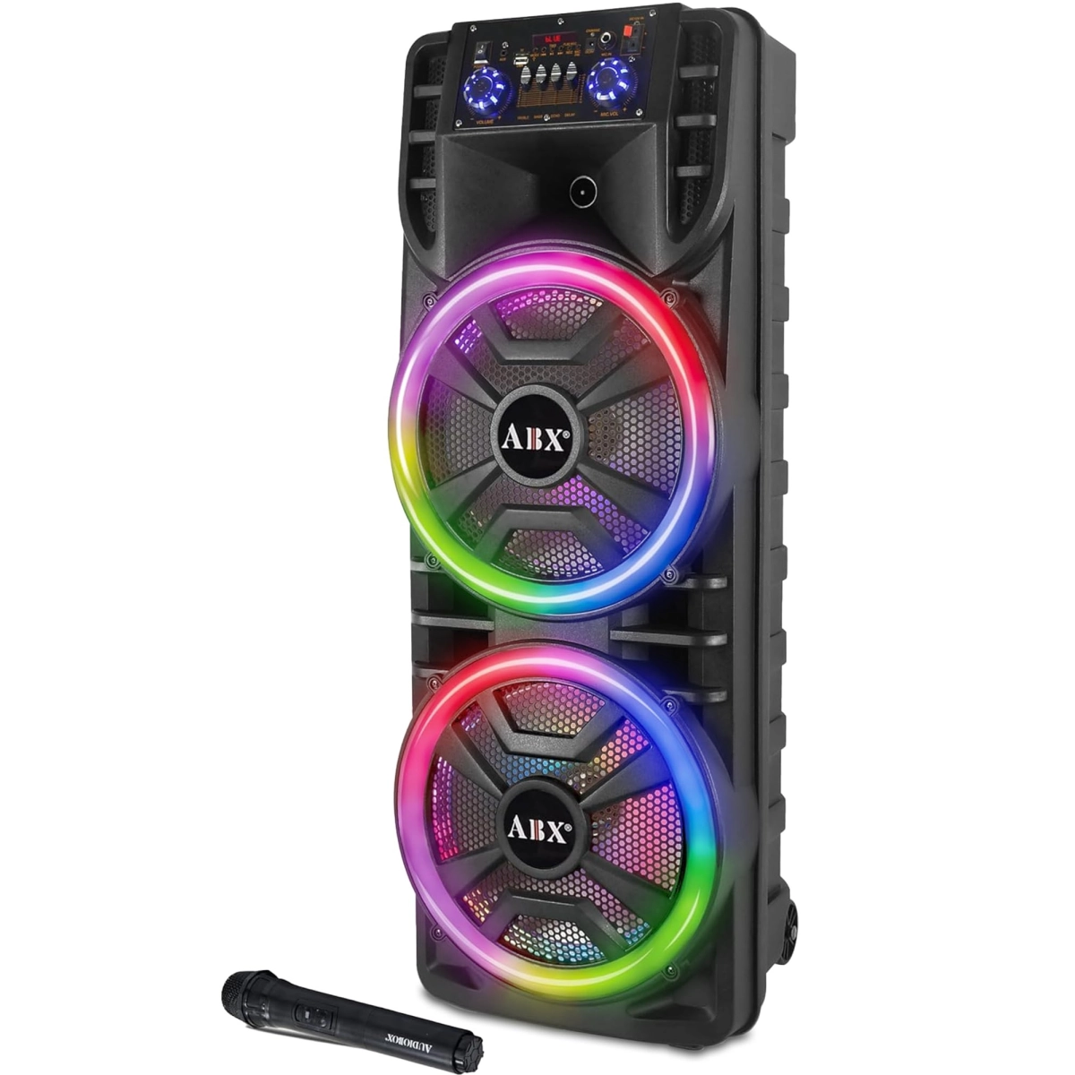 - Двойни 12-инчови говорители за дълбок бас и богат звук, подходящ както за караоке, така и за музикално озвучаване на събития.