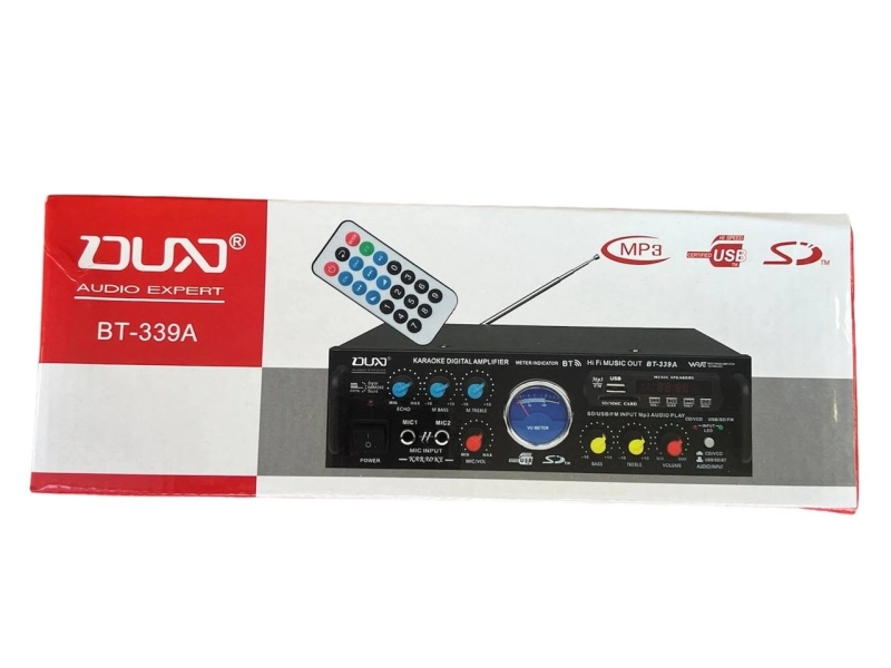 Описание:Аудио усилвателят е многофункционален стерео усилвател, който предлага високо качество на звука, безжично свързване чрез Bluetooth и множество възможности за свързване с различни аудио устройства. Той е предназначен както за домашно озвучаване, така и за професионална употреба в малки помещения или офиси. Компактен и лесен за употреба, този усилвател осигурява мощен звук и лесно управление на свързаните устройства. Особености:Лесно свързване с всякакви Bluetooth устройства като смартфони, таблети и лаптопи за безжично възпроизвеждане на музика. Поддържа RCA входове за традиционни аудио източници (CD плейъри, DVD плейъри и други), USB порт за възпроизвеждане на музика от флаш памет и слот за SD карта. Комплектът включва дистанционно управление за лесно превключване между функциите и настройка на силата на звука от разстояние. Вградена възможност за настройка на басите, високите честоти и баланса на звука. Вградено FM радио за слушане на радио станции с възможност за автоматично сканиране на честоти. Дизайн:Продукта се отличава с модерен и компактен дизайн, подходящ за различни интериори. Панелът е изработен от метал с гладко черно покритие и има интуитивен дисплей, който показва информация за входния източник и текущата честота на FM радиото. Контролните бутони са разположени предимно на предния панел за лесен достъп, докато задната част съдържа всички аудио входове и изходи. Технически характеристики:Изходна мощност: 2 x 40W;Импеданс: 4-16 Ohms;Честотен обхват: 20Hz – 20kHz;Bluetooth обхват: До 10 метра;FM честоти: 87.5MHz - 108MHz;Входове: 2 RCA входа, USB порт, SD слот, FM антена;Захранване: AC 220V / 50Hz;Размери: 26 см x 21 см x 6 см.;Тегло: 1.8 кг. Какво ще намерите в опаковката:1 х Аудио усилвател BT-339A;1 х Дистанционно управление;1 х FM антена;1 х Захранващ кабел;Ръководство за употреба;Транспортна опаковка;Гаранция: 12 месеца.