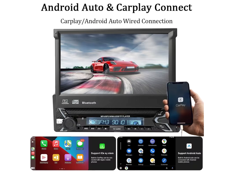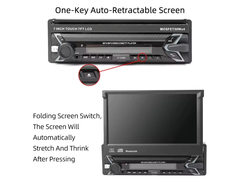 Модернизирайте всеки еднодинов слот с моторизиран 7″ изскачащ IPS екран, Android 15, безжичен Apple CarPlay/Android Auto и силен MOSFET усилвател 50 W ×4. Перфектна визия + брутален звук. 😊