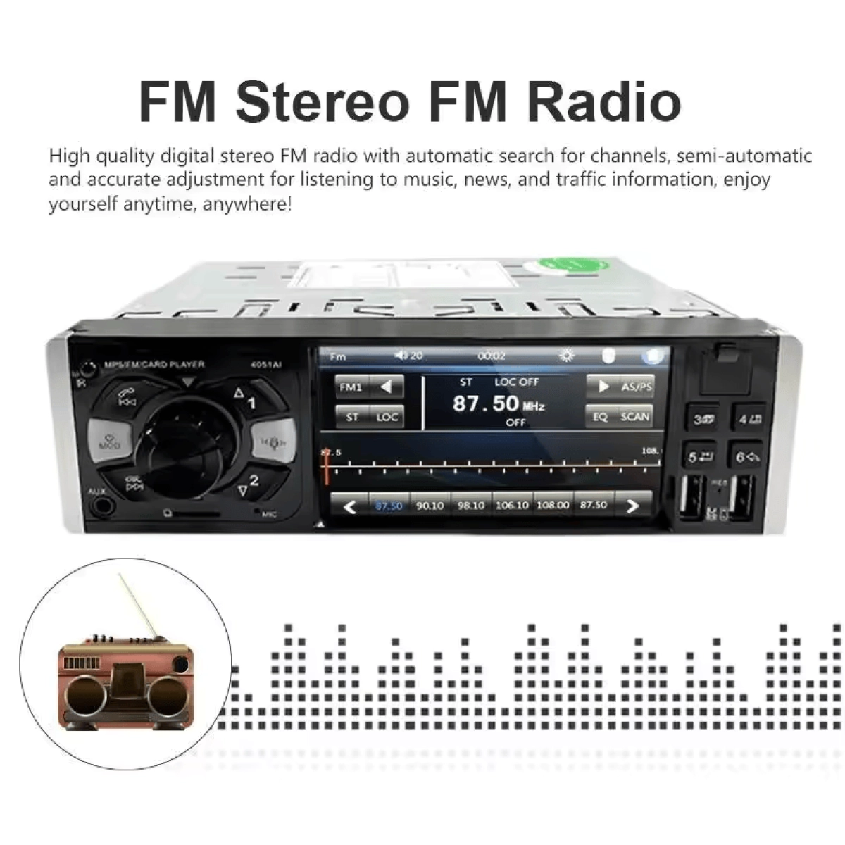 - Вграден FM тунер с честотен обхват от 87.5 до 108 MHz и възможност за запаметяване на предпочитани радиостанции за бърз достъп.