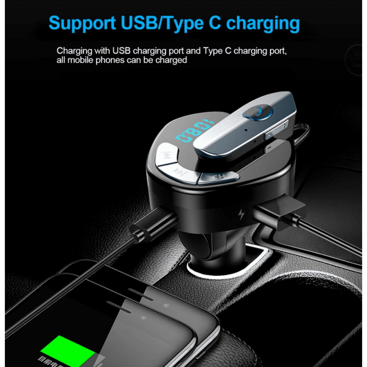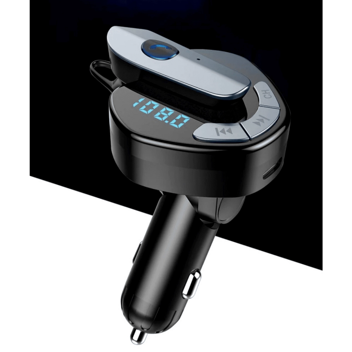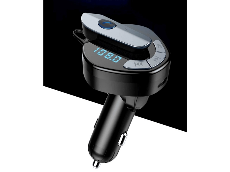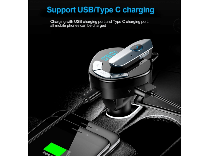 Безжичен FM трансмитер с Bluetooth hands-free слушалка V8 за автомобил Безжичният трансмитер V8 е иновативно устройство, което съчетава удобството на FM трансмитер с висококачествена Bluetooth hands-free слушалка. Това решение е идеално за безопасно провеждане на телефонни разговори и слушане на музика директно през автомобилната аудио система. Основни характеристики Bluetooth версия 4.2 с усъвършенствана технология за намаляване на шума и по-ясен звук по време на разговори. FM трансмитер с широк обхват за лесно свързване към всяко автомобилно радио чрез свободна FM честота. Hands-free слушалка с бутон за бързо приемане и отказване на повиквания, осигуряваща безопасно шофиране. Зареждане на слушалката чрез micro USB или директно от трансмитера, за по-голямо удобство и автономност. Двойни USB порта (USB и USB Type-C) с изход 5V/2.1A за зареждане на мобилни устройства по време на пътуване. Предимства Комбинира мултифункционален FM трансмитер и безжична слушалка в едно компактно устройство. Подобрена комуникация без ръце, което гарантира по-безопасно и комфортно шофиране. Лесна инсталация и работа с един бутон за управление на обаждания и музика. Съвместимост с всички смартфони с Bluetooth функционалност, без нужда от допълнителни кабели. Защо да изберете този продукт Безжичният трансмитер V8 е перфектното решение за всеки шофьор, който цени удобството и безопасността на пътя. Съчетавайки висококачествен звук, функционалност и лесна употреба, този трансмитер с hands-free слушалка позволява безпроблемни разговори и музикално забавление, докато сте зад волана. Поръчайте сега и се насладете на свободата и сигурността при шофиране с безжичния трансмитер V8!