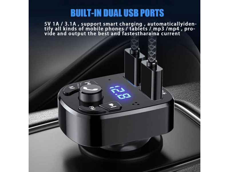Технически характеристики: – Автомобилен FM трансмитер – Hands Free функция – приемане, отхвърляне, преизбиране и други функции – Дигитален дисплей– 2бр. USB порт за зареждане на акумулаторни устройства 3.1А и възпроизвеждане на флаш памет (флашка) .– Micro SD. – Система за намаление на шума (CVC) по време на разговор – Bluetooth 5.0 функция – съвместим с всички видове телефони – Излъчва в диапазона 87,5-108MHz – Захранване: 12/24V