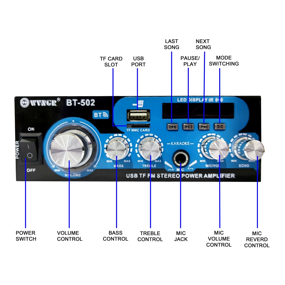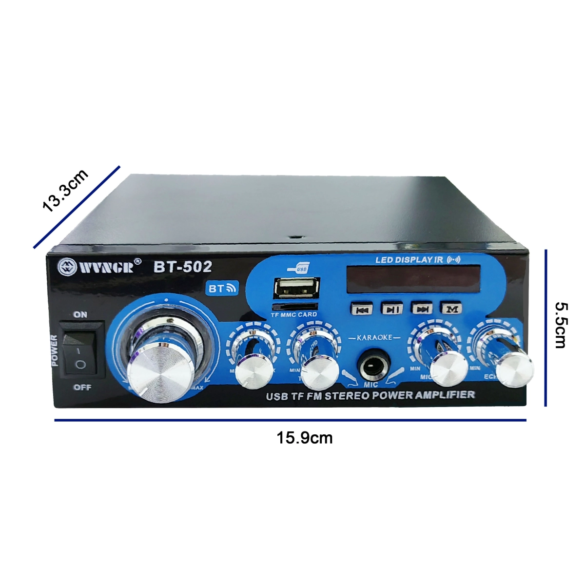 Домашен Bluetooth усилвател BT-502 е идеалното решение за качествено аудио възпроизвеждане в домашна или малка офис среда. Този компактен и мощен усилвател комбинира удобството на безжично свързване чрез Bluetooth с възможността за възпроизвеждане на музика от USB устройства и Micro SD карти, както и FM радио с широк честотен обхват. С вграден TFT дисплей и дистанционно управление, устройството осигурява лесно и интуитивно управление на всички функции.