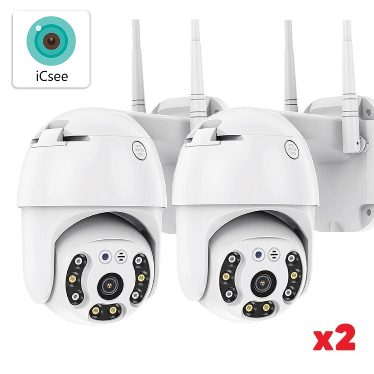 Купете 2 външни AI WiFi камери с въртене и 5MP качество. Управлявайте лесно с ICSee, идеални за видеонаблюдение на открито.
