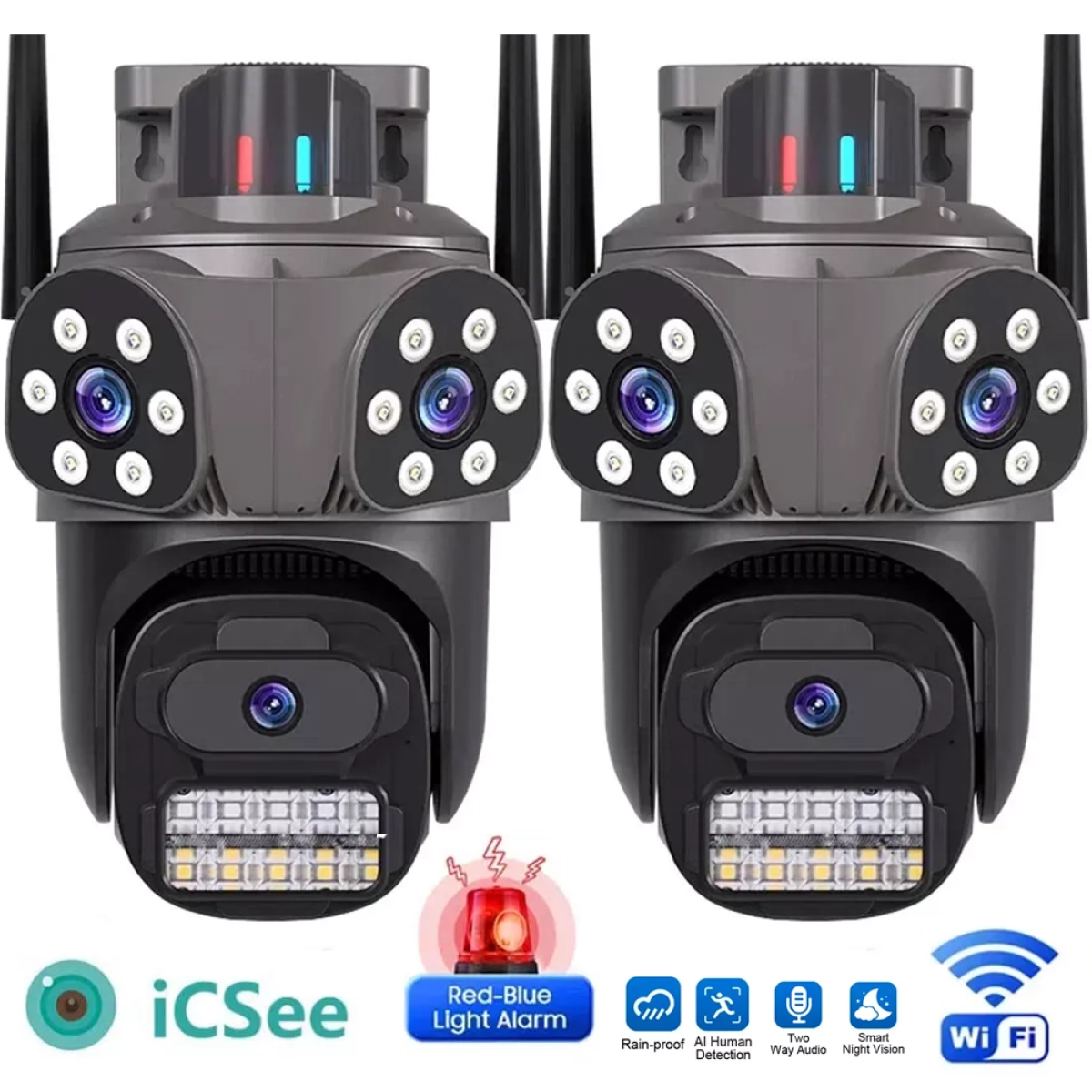 Комплект от две външни WiFi камери с AI и 10MP резолюция с три обектива в черен цвят Този комплект от две въртящи външни WiFi камери с изкуствен интелект и висока резолюция от 10MP предлага надеждно и професионално видеонаблюдение за вашия дом или бизнес. С три обектива и иновативни функции за широкоъгълно заснемане, камерите осигуряват максимален контрол и детайлно наблюдение дори при слаба осветеност. Основни характеристики на двойните външни WiFi камери с три обектива Три обектива с фокусно разстояние 3.6 мм, които позволяват едновременно наблюдение на различни ъгли и обхват на пространството. 10-мегапикселова резолюция за кристално ясни изображения с висока детайлност, подходящи за идентифициране на обекти и лица. 5 пъти оптично увеличение, позволяващо приближаване без загуба на качество, което гарантира прецизно наблюдение на отдалечени обекти. Въртящ механизъм с 270° хоризонтален и 90° вертикален обхват за покриване на максимална зона около камерата. Интелигентна аларма за движение с автоматично включване на LED светлини и известия в реално време чрез мобилното приложение. Двупосочна аудио връзка за комуникация на живо чрез вградения микрофон и високоговорител. Цветно нощно виждане, осигурено от двойни светлини, което позволява наблюдение и при пълна тъмнина. Висока степен на защита IP66 срещу прах, вода и сурови атмосферни условия, идеални за външна употреба. Безжично управление чрез WiFi и приложението ICSee за лесен достъп и контрол от всяка точка. За какво се използват тези WiFi AI камери с три обектива Този комплект от двойни външни камери е идеален избор за наблюдение на големи пространства, като дворове, паркинги, входове на сгради, търговски обекти и други открити места. Технологията с три обектива позволява едновременно следене на различни зони, което елиминира мъртвите точки и повишава сигурността. Благодарение на интелигентните функции като аларма и персонализирана зона за движение, вие получавате своевременни известия за всяко подозрително събитие, което ви дава спокойствие и контрол. Предимства на двойните въртящи външни WiFi камери с AI 10MP Комплексно покритие на наблюдавания обект с помощта на тройната оптична система и въртящия механизъм. Висока резолюция и оптично увеличение за прецизни изображения и възможност за детайлно приближаване. Интелигентна алармена система, която минимизира фалшивите сигнали чрез персонализирани зони за засичане на движение. Лесна инсталация и управление без нужда от сложна окабеляване, благодарение на безжичната WiFi връзка. Сигурна и устойчива конструкция, която издържа на екстремни климатични условия и дълготрайна употреба на открито. Възможност за споделяне с множество потребители, което улеснява контрола и наблюдението от различни устройства. Изберете този надежден комплект от въртящи външни WiFi AI камери с тройни обективи и 10MP резолюция, за да осигурите максимална защита и спокойствие на вашия дом или бизнес. Поръчайте сега и се възползвайте от модерната технология за професионално видеонаблюдение!