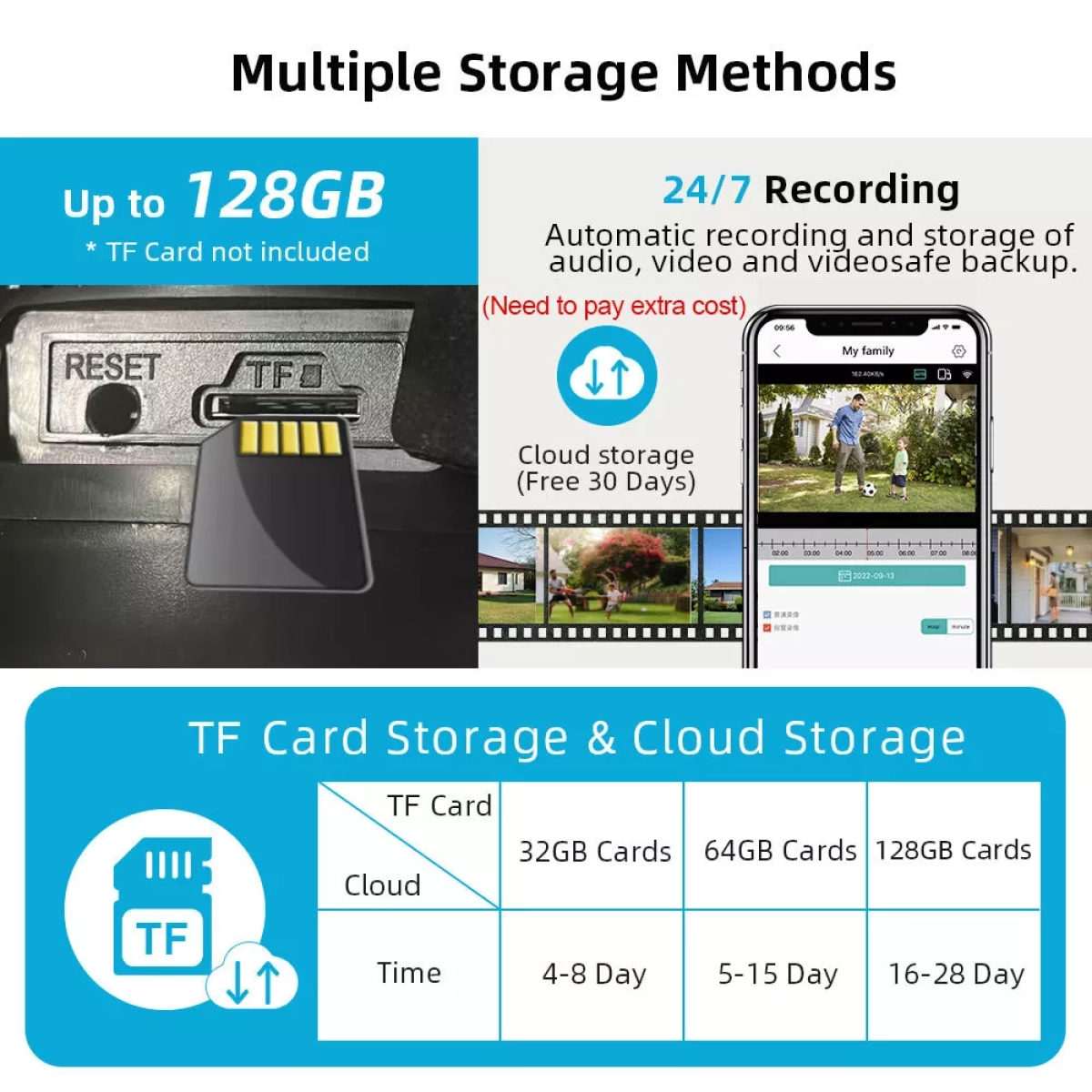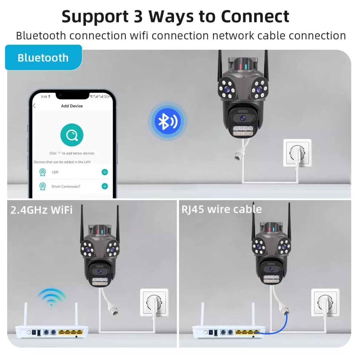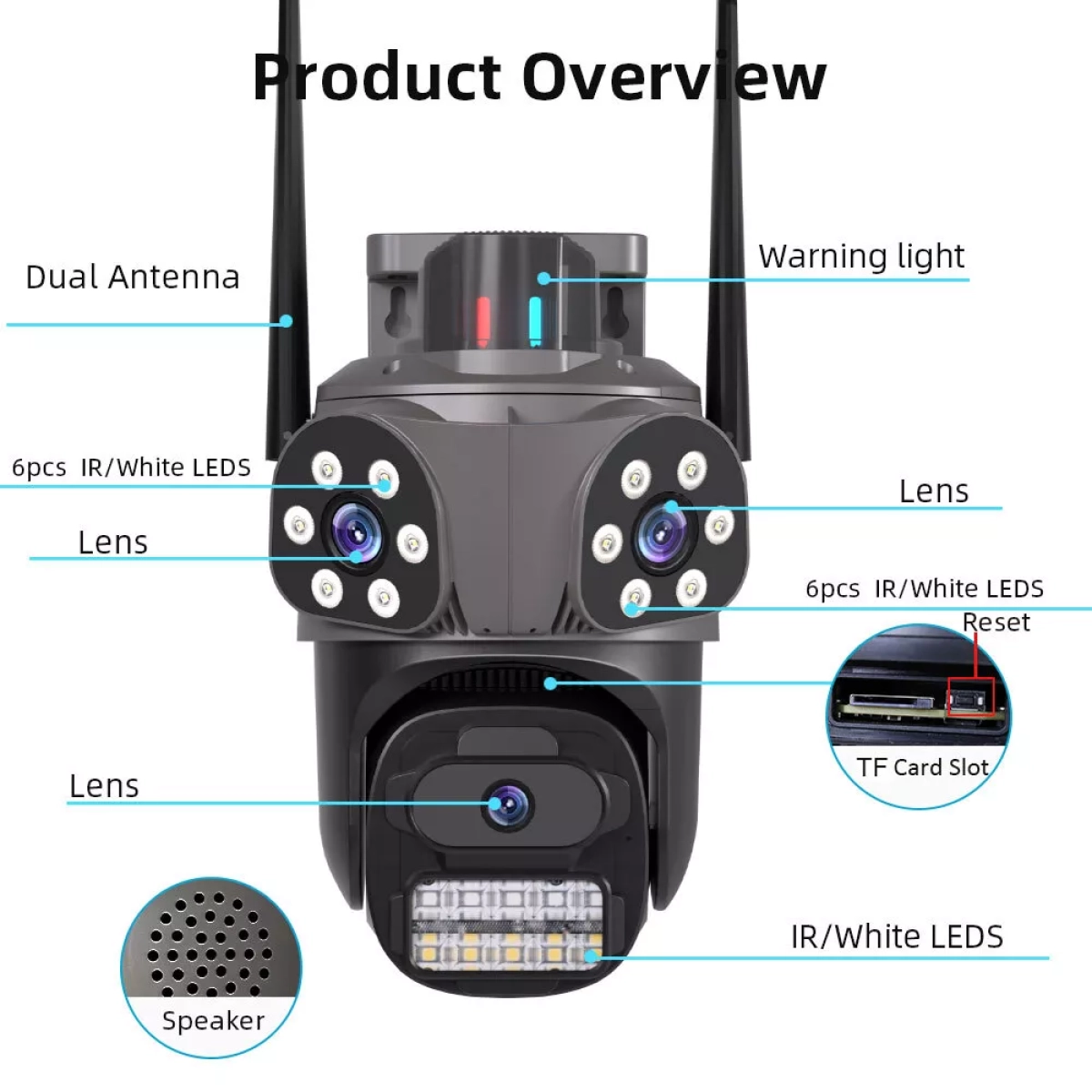 Изберете този надежден комплект от въртящи външни WiFi AI камери с тройни обективи и 10MP резолюция, за да осигурите максимална защита и спокойствие на вашия дом или бизнес. Поръчайте сега и се възползвайте от модерната технология за професионално видеонаблюдение!