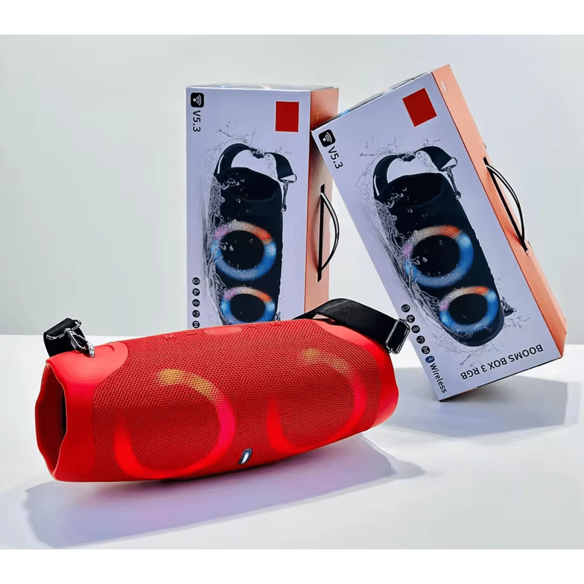 Голяма Bluetooth тонколона Booms Box 3 RGB с червен корпус и динамично осветление Открийте силата на качествения звук с голямата Bluetooth тонколона Booms Box 3 RGB, която впечатлява с модерен дизайн и иновативни функции. Този преносим високоговорител с червен корпус и цветни светлини предлага отлично аудио изживяване, подходящо за всякакви ситуации – от домашни партита до работа в офиса. Основни характеристики на Booms Box 3 RGB Bluetooth 5.3 технология за стабилна и бърза връзка с всякакви устройства в радиус до 15 метра. Мощен звук с кристално чисти баси, които гарантират високо качество на възпроизвеждане както при ниски, така и при високи честоти. Вграден акумулатор с капацитет 4000mAh, осигуряващ до 5 часа непрекъснато възпроизвеждане без нужда от зареждане. RGB светлини с динамични ефекти, които допълват атмосферата и правят тонколоната подходяща за парти или събития. Многофункционални входове – AUX, USB и TF/MicroSD карта, позволяващи свързване на различни носители и устройства. FM радио функция за слушане на любими радиостанции без необходимост от външни устройства. Call функция – възможност за провеждане на безжични телефонни разговори чрез свързания смартфон. Компактни размери и удобна презрамка за лесно пренасяне навсякъде с вас. Приложение и употреба на Booms Box 3 RGB Тази голяма Bluetooth тонколона е идеална за разнообразни ситуации – от слушане на музика в домашни условия, през озвучаване на малки събития и събирания, до ползване като мобилен говорител при спорт, пътувания и къмпинг. Благодарение на широката съвместимост с устройства и множество входове, тя се адаптира лесно към индивидуалните ви нужди за аудио забавление. Какво включва комплектът Booms Box 3 RGB 1 бр. Bluetooth тонколона с RGB светлини и червен корпус 1 бр. удобна презрамка за лесно пренасяне 1 бр. USB кабел за зареждане, осигуряващ бързо и ефективно пълнене на батерията Изберете Booms Box 3 RGB за мощен и стилен звук навсякъде, където пожелаете. Поръчайте сега и се насладете на кристално чисто аудио и впечатляващи светлинни ефекти!