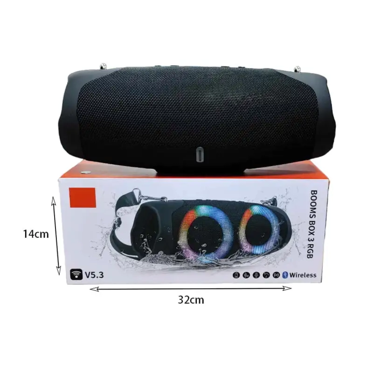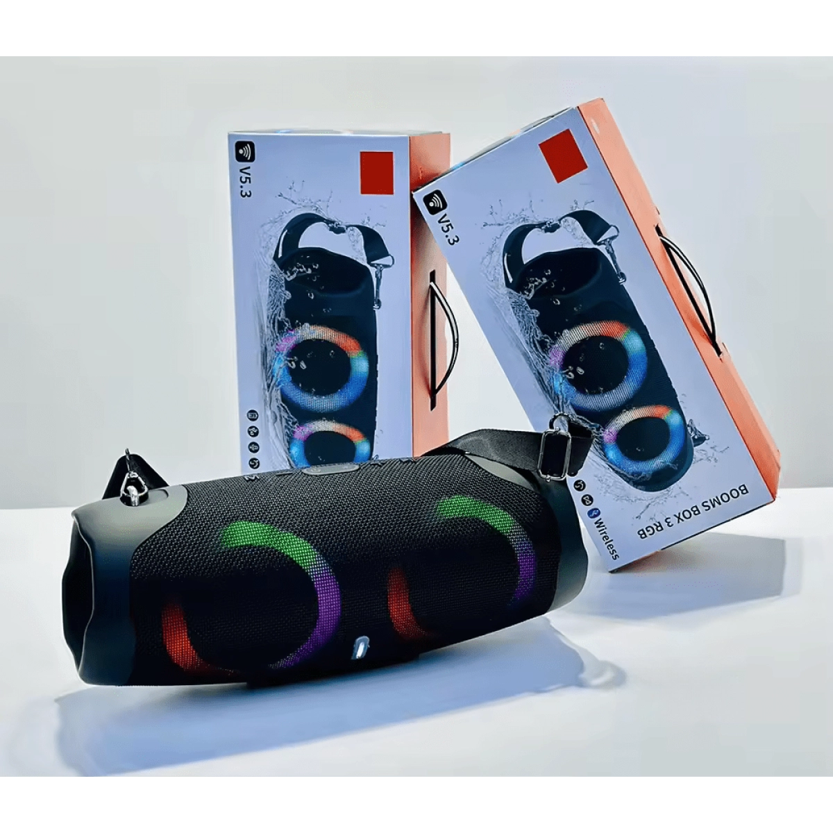Голяма Bluetooth тонколона Booms Box 3 RGB с мощен звук и стилен черен дизайн Голяма Bluetooth тонколона Booms Box 3 RGB е перфектното решение за любителите на качествения звук и модерния външен вид. Тази преносима тонколона съчетава иновативната технология Bluetooth 5.3 с впечатляваща мощност и ярко RGB осветление, което създава неповторима атмосфера при всяко прослушване. Независимо дали сте на парти, в офиса или на открито, тя осигурява наситен звук с дълбоки баси и кристално чисти високи честоти. Основни характеристики Bluetooth 5.3 технология за стабилна и бърза безжична връзка с устройства на разстояние до 15 метра. Мощен аудио изход, който гарантира силен и ясен звук дори при високи нива на усилване. Вграден RGB LED ефект, който създава динамично светлинно шоу и допълва музикалния фон. Входове за AUX, USB и TF/MicroSD карта – възможност за свързване на различни устройства и възпроизвеждане на музика от множество източници. Вградена акумулаторна батерия с капацитет 4000mAh, осигуряваща до 5 часа непрекъснато възпроизвеждане на музика. Call функция за провеждане на телефонни разговори директно през тонколоната. Компактен и здрав корпус с размер около 31 см, удобно преносим с включената презрамка. Бързо зареждане – приблизително 1 час за пълно зареждане на батерията. Предимства на Booms Box 3 RGB Високо качество на звука – детайлно възпроизвеждане на всички честоти, което удовлетворява и най-взискателните слушатели. Универсална съвместимост с всякакви Bluetooth устройства, включително смартфони, таблети и лаптопи. Мобилност и удобство – лесно пренасяне благодарение на компактния дизайн и презрамката за носене. Множество опции за свързване, което позволява използване както с безжични, така и с кабелни устройства. Светлинни ефекти, които правят всяко събитие по-забавно и визуално атрактивно. Дълъг живот на батерията, който осигурява часове забавление без нужда от често зареждане. За какво се използва Тази голяма Bluetooth тонколона е идеална за множество ситуации – от домашни партита и събирания с приятели до професионални презентации и офис употреба. Можете да я използвате на открито по време на пикник или къмпинг, както и в колата или стаята, където пожелаете. С мощния си звук и разнообразните опции за свързване, Booms Box 3 RGB се превръща в универсален спътник за всякакви аудио преживявания. Изберете голямата Bluetooth тонколона Booms Box 3 RGB с мощен звук и стилен дизайн още днес и се насладете на безкомпромисно качество и удобство при слушане на любимата музика навсякъде!
