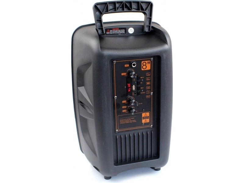 Комплекта съдържа:1 бр. Акумулаторна караоке колона1 бр. Жичен микрофон1 бр. Кабел за захранване на системата за караоке – 220V1 бр. Дистанционно управление.Техническа характеристика:Мощност: 8 инчов басов говорителНиво на звука: 85 dBЧестота: 100Hz – 20kHzЗахранване: 220V.Спецификация:Караоке тонколона с акумулаторна батерия (зарежда се от 220V)ЦВЕТОМУЗИКА – вградени светлинни ефекти, с копче за включване и изключванеBLUETOOTH функция – сдвояването колоната с GSM, компютър, лаптоп и слушате любимата си музика безжично – над 10 метраFM tuner – РАДИОДистанционно управление (включено в комплекта)Възможност за самостоятелно използване без връзка с компютър чрез:слота за SD/MMC/MMS карта паметслота за USB флашкаAUX вход от външно устройство (компютър, GSM, Ipod, PSP)LED ДИСПЛЕЙВход за 1 брой микрофонЖичен микрофон 1 брой – включен в комплектаУдобна прибираща се дръжка – за лесно пренасяне на тонколонатаРазмери: ш/в/д – 24 / 36.5 / 20 см