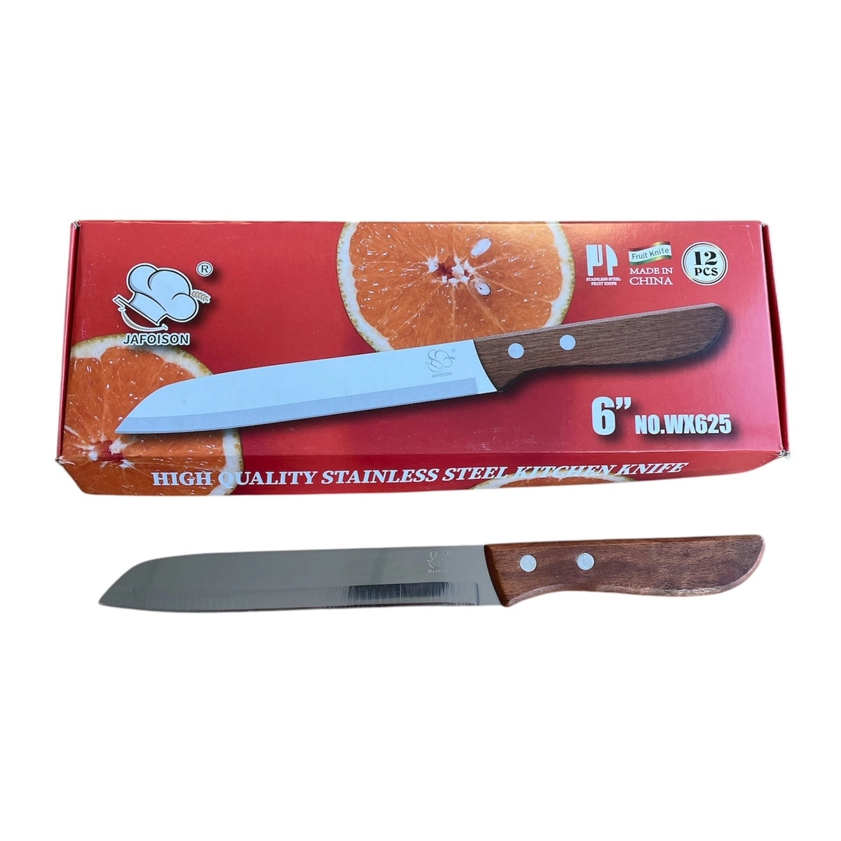 Комплект от 12 остри кухненски ножа JAFOISON WK625 за професионална употреба Представяме ви комплект 12 бр. остри ножове JAFOISON WK625, създадени специално за кухнята, които съчетават високо качество и издръжливост. Този набор от ножове е идеалното решение за всяка домакиня и професионален готвач, търсещи надеждност и прецизност при рязане и обработка на хранителни продукти. Основни характеристики на ножовете JAFOISON WK625 Обща дължина от 27.5 см за удобен контрол и маневреност при работа с различни продукти. Острие с дължина 15.5 см, което осигурява прецизно и чисто рязане без усилие. Изработени от висококачествена неръждаема стомана, устойчива на корозия, гарантираща дълготрайна острота и здравина. Класическа дървена дръжка, която предлага комфортно захващане и устойчивост при продължителна употреба. Комплектът включва 12 броя ножове, подходящи за разнообразни готварски задачи – от рязане на месо до нарязване на зеленчуци и плодове. Предимства на комплекта кухненски ножове JAFOISON WK625 Универсалност – ножовете са подходящи за различни видове хранителни продукти и практически ситуации в кухнята. Издръжливост и устойчивост на износване благодарение на качествените материали и прецизната изработка. Ергономичен дизайн на дръжките, който намалява умората при продължителна работа и осигурява стабилно захващане. Лесна поддръжка – гладката повърхност на острието позволява бързо почистване и запазване на хигиената в кухнята. Стилен и класически външен вид, който ще допълни всяко кухненско пространство и ще внесе професионален дух. За какво се използва комплектът JAFOISON WK625 Този набор от остри ножове е предназначен за широк спектър от кухненски дейности. Подходящ е за рязане на месо, зеленчуци, плодове, хляб и други хранителни продукти. Благодарение на разнообразието в броя и размерите, комплектът позволява лесно и ефективно изпълнение на ежедневните задачи при готвене както в домашни, така и в професионални условия. Как да поддържате ножовете от комплекта За да запазите остротата и дълготрайността на ножовете JAFOISON WK625, препоръчваме да ги миете ръчно с топла вода и мек препарат, да ги подсушавате веднага след измиване и да използвате подходящи точила за поддържане на рязкостта. Съхранявайте ги на сухо място, за да предотвратите повреди и ръжда. Изберете комплекта 12 бр. остри ножове JAFOISON WK625 и внесете професионално качество и удобство във вашата кухня още днес!