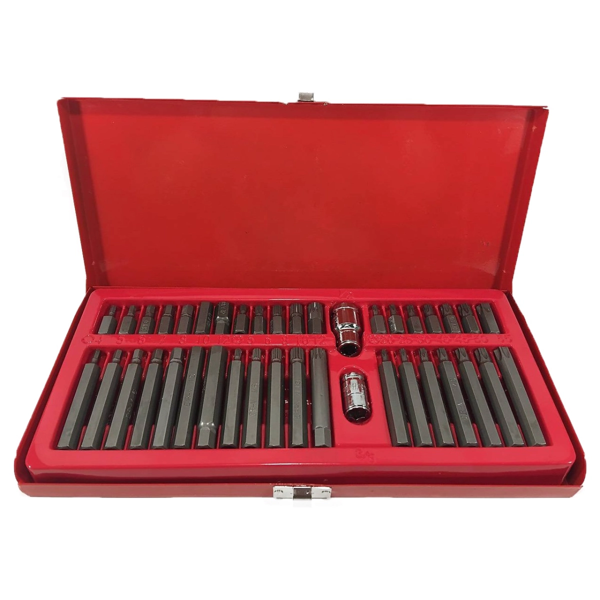 В комплекта има накрайници тип Torx и XZN (с 12 остриета), като всеки тип е наличен в различни размери и дължини.
