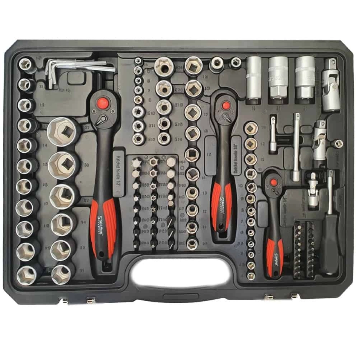 - Тресчотки с различни размери – 1/2", 3/8" и 1/4" тресчотки за максимална гъвкавост при работа в тесни и труднодостъпни места.