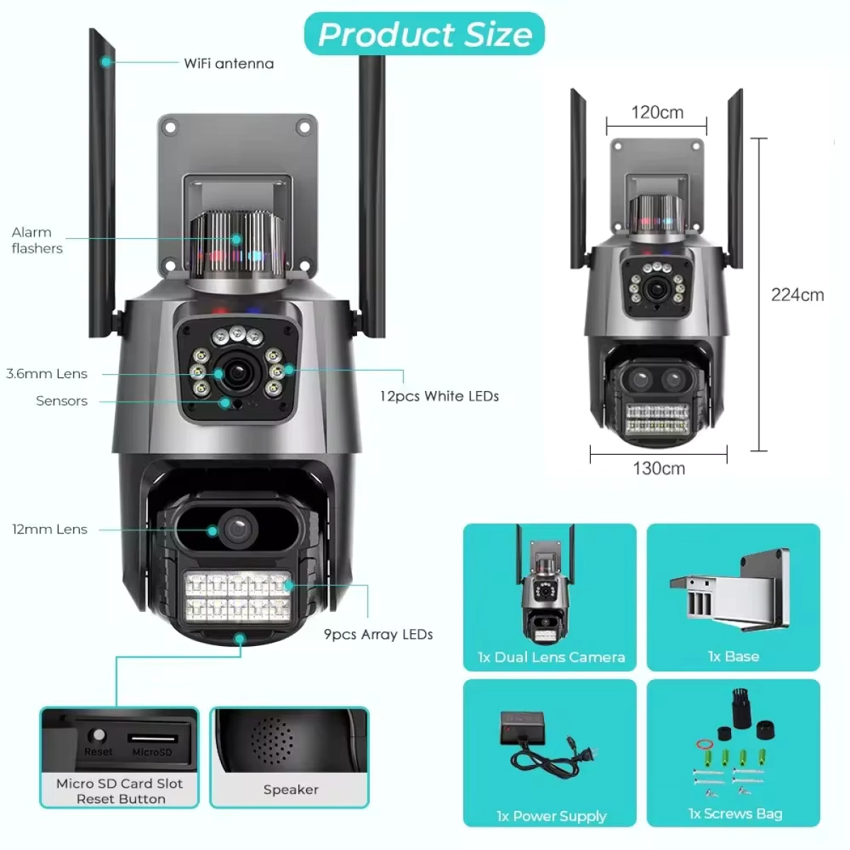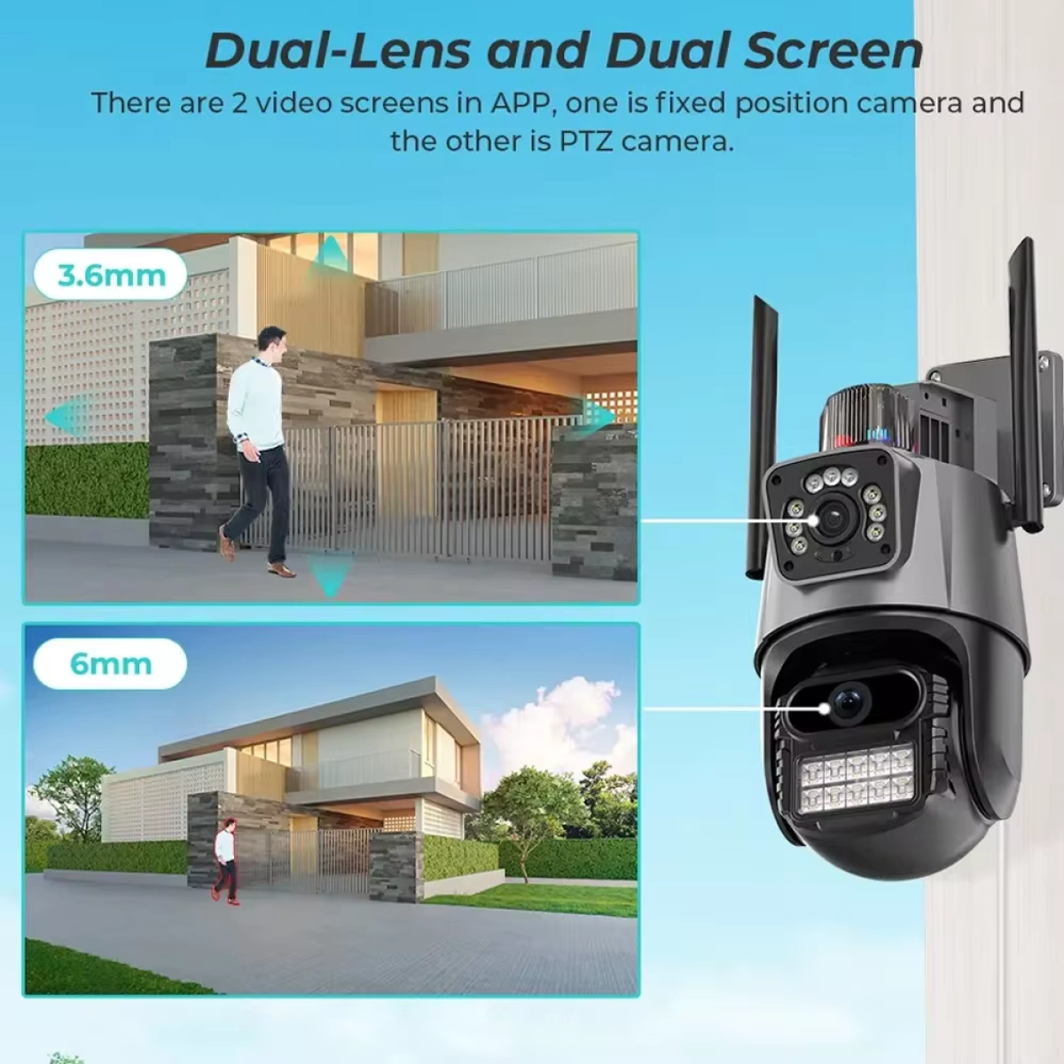Този комплект от 2 броя черни двойни външни WiFi AI камери предлага надеждно и иновативно решение за охрана на дома или бизнеса. С висока резолюция от 8MP и интелигентни функции като AI разпознаване на хора, тези камери осигуряват прецизно и ефективно видеонаблюдение при всякакви условия.