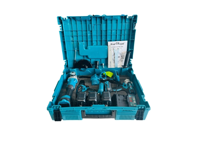 Комплект от акумулаторна мини резачка, ъглошлайф, гайковерт и винтоверт 36V с 3 броя батерии 8Ah и зарядно KraftRoyal