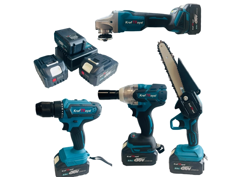 Комплектът Съдържа Гайковерт, мини резачка, Ъглошлайф и Винтоверт + 3 броя Батерии 36V 8Ah + Зарядно устройство + Куфар за лесно транспортиране