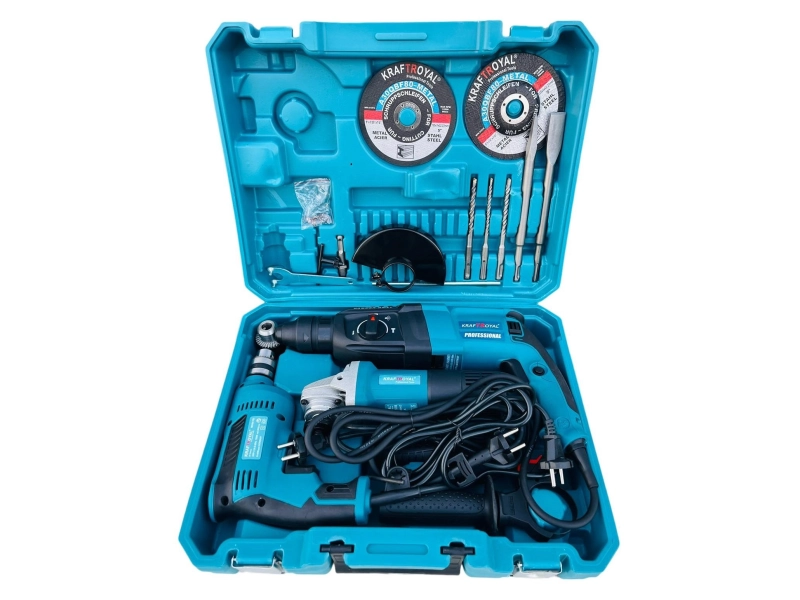 Комплект от перфоратор, ъглошлайф 125 мм и бормашина 1200W KraftRoyalКомплектът електроинструменти Kraftroyal е универсален и ефективен комплект, който ще ви помогне с различни работни проекти. Всеки инструмент се захранва от 220 V мрежа, което ви дава мощността, от която се нуждаете, за да завършите задачите.Пакетът включва и редица полезни аксесоари като гъвкави дискове за рязане на метал, спирали (свредла) за пробиване в зидария, длета (плоски и заострени), дистанционер, патронник и гаечни ключове. Включена е и кутия за съхранение, за да поддържате вашите инструменти организирани и защитени.ХАРАКТЕРИСТИКИ НА ЪГЛОШЛАЙФ:Мощност: 1200WНоминално напрежение: 220VНоминална честота: 50HzОбороти на празен ход : 11000 об/мин 1Вътрешен диаметър на диска: 22-23ммМаксимален външен диаметър на диска: 115ммМаксимална дебелина на шлифовъчния диск: 6ммДължина на резбата на вретеното: 14ммИдеален е за рязане, шлифоване и полиране на различни повърхности.Ергономичният гумиран дизайн на дръжката ви осигурява комфорт и контрол при използване.ХАРАКТЕРИСТИКИ НА ПЕРФОРАТОР:Мощност 1200 WЕнергия на удара 0 – 3 JЧестота на ударите при номинални обороти 0 – 4.000 /минНоминални обороти 0 – 900 /минЗахват на инструмента SDS-plus с вградена защита срещу прахДиаметър на отвора в бетон със свредло за перфоратори 4 – 26 ммОптимална област на приложение в бетон със свредло за перфоратори 8 – 16 ммМаксимален диаметър на отвора в зидария с корона за ядково пробиване 68 ммМаксимален диаметър на пробиване в стомана 13 ммМаксимален диаметър на отвора в дърво 30 ммБезстепенно регулиране на оборотите – Дясно/ляво въртене3 режима на работа – пробиване , ударно пробиване , къртенеСъс слаби вибрации при работа и празен ходЛеко притискане, за работа без умораВградена защита срещу прахСферична връзка на кабелаПроменливо фиксиране на секача в 12 положения под различен ъгълРъкохватка с покритиеМеко противоплъзгащо покритие на главната и допълнителната ръкохватка за сигурно хващане