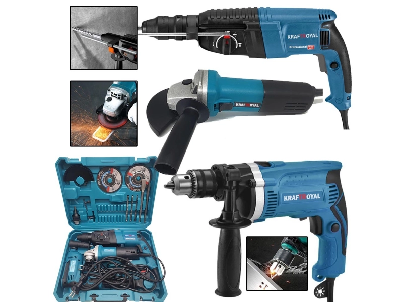 Комплектът електроинструменти Kraftroyal е универсален и ефективен комплект, който ще ви помогне с различни работни проекти. Всеки инструмент се захранва от 220 V мрежа, което ви дава мощността, от която се нуждаете, за да завършите задачите.