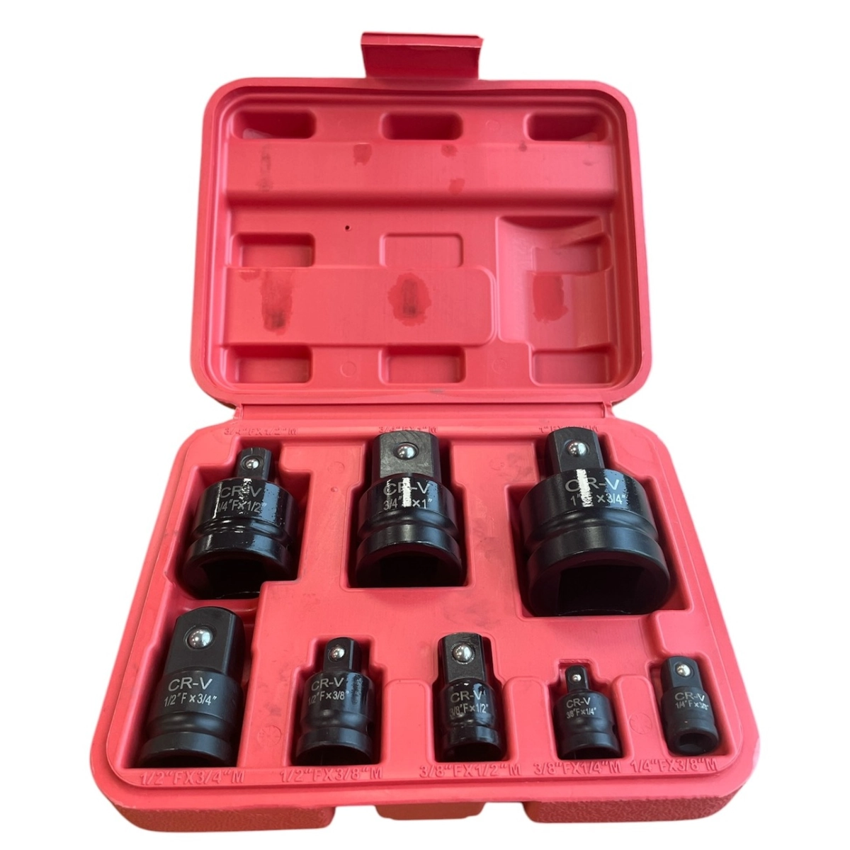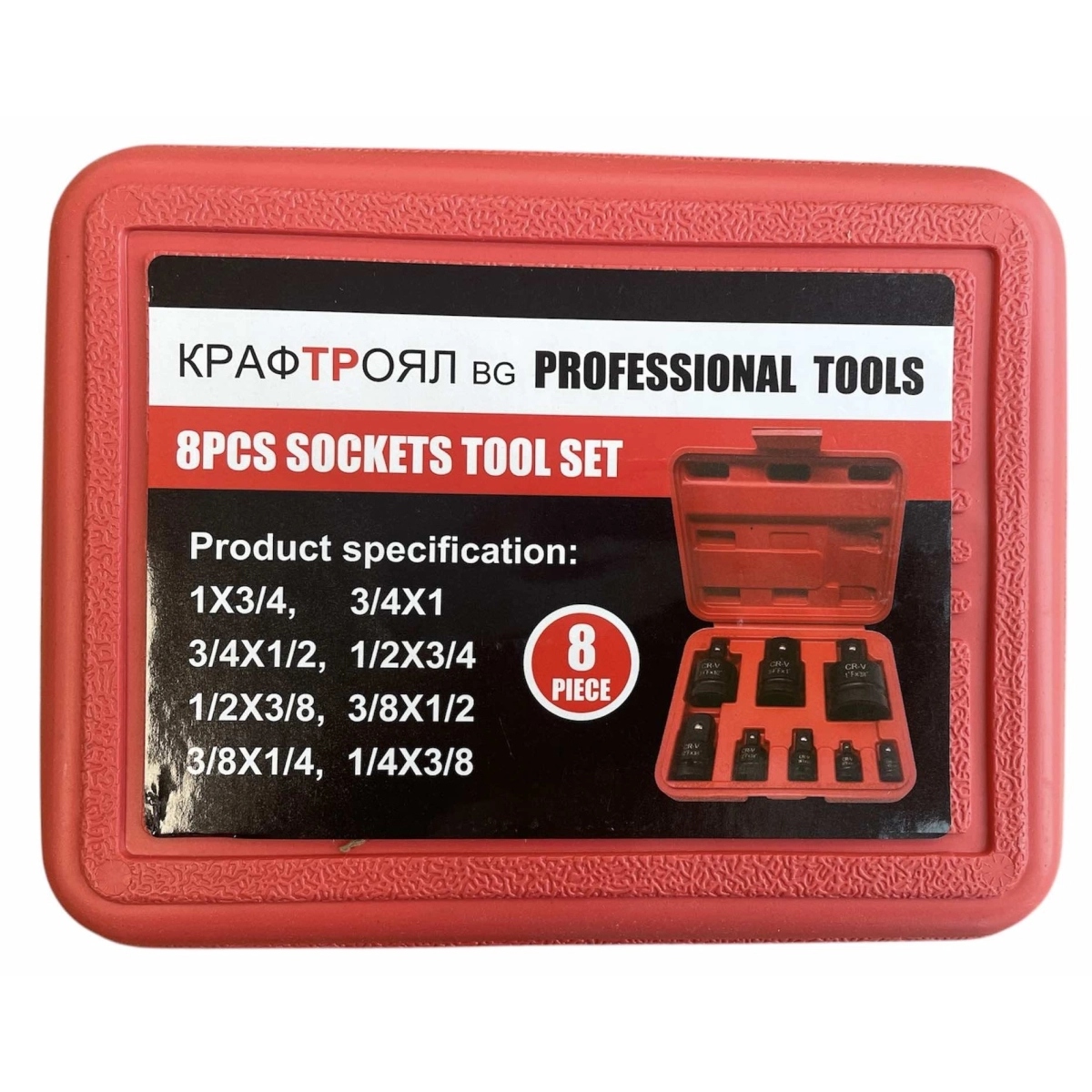 • Разнообразие от размери – комплектът включва 8 различни преходника, позволяващи лесно свързване между стандартните размери на гнездата: 1/4", 3/8", 1/2", 3/4" и 1".