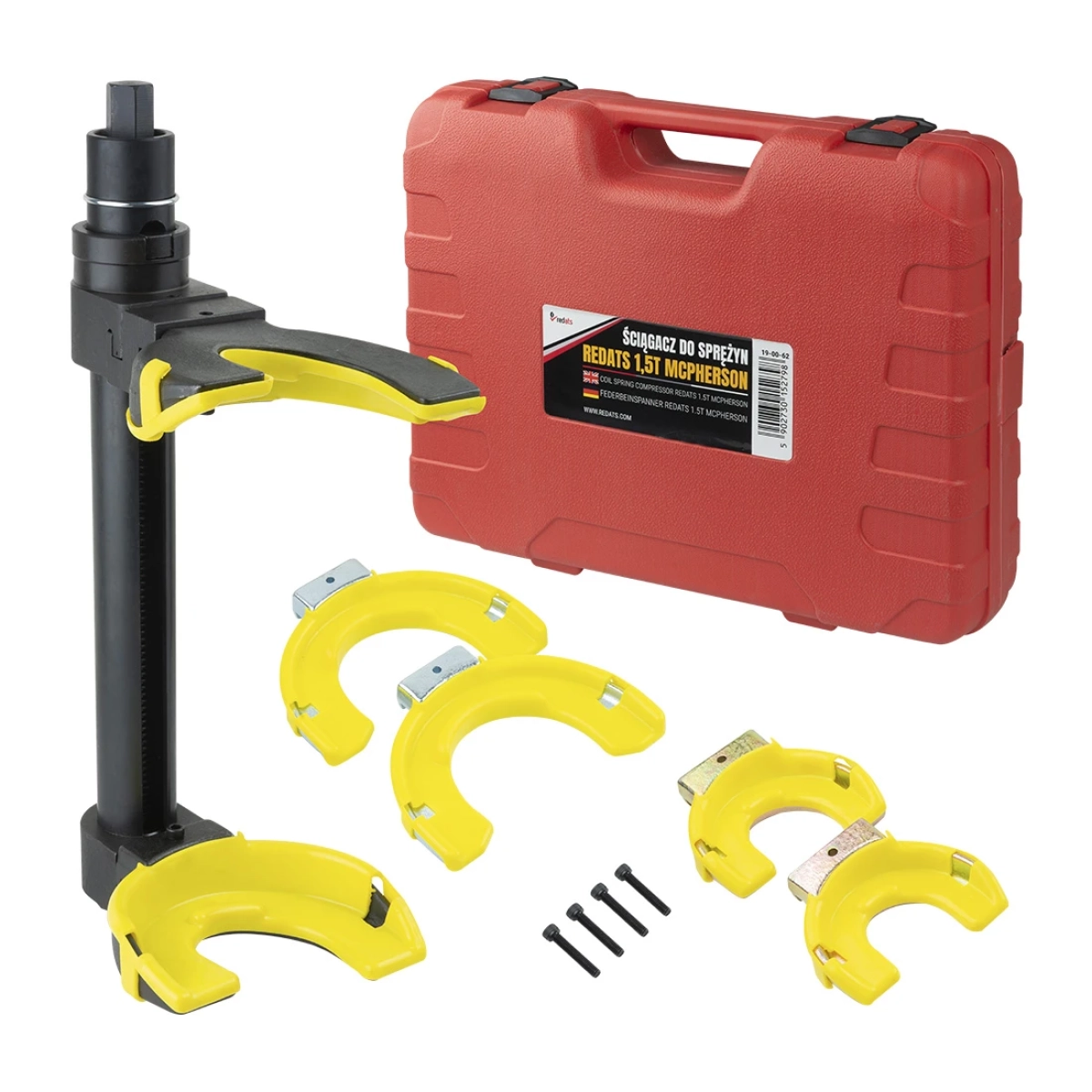 Този комплект за монтаж и демонтаж на пружини е специално създаден, за да улесни безопасната и прецизна работа с различни видове автомобилни и индустриални пружини. Съчетавайки здрава конструкция и регулируеми елементи, инструментът позволява бързо и ефективно разтягане и сгъване на пружините, което го прави незаменим помощник за всеки автосервиз или механична работилница.