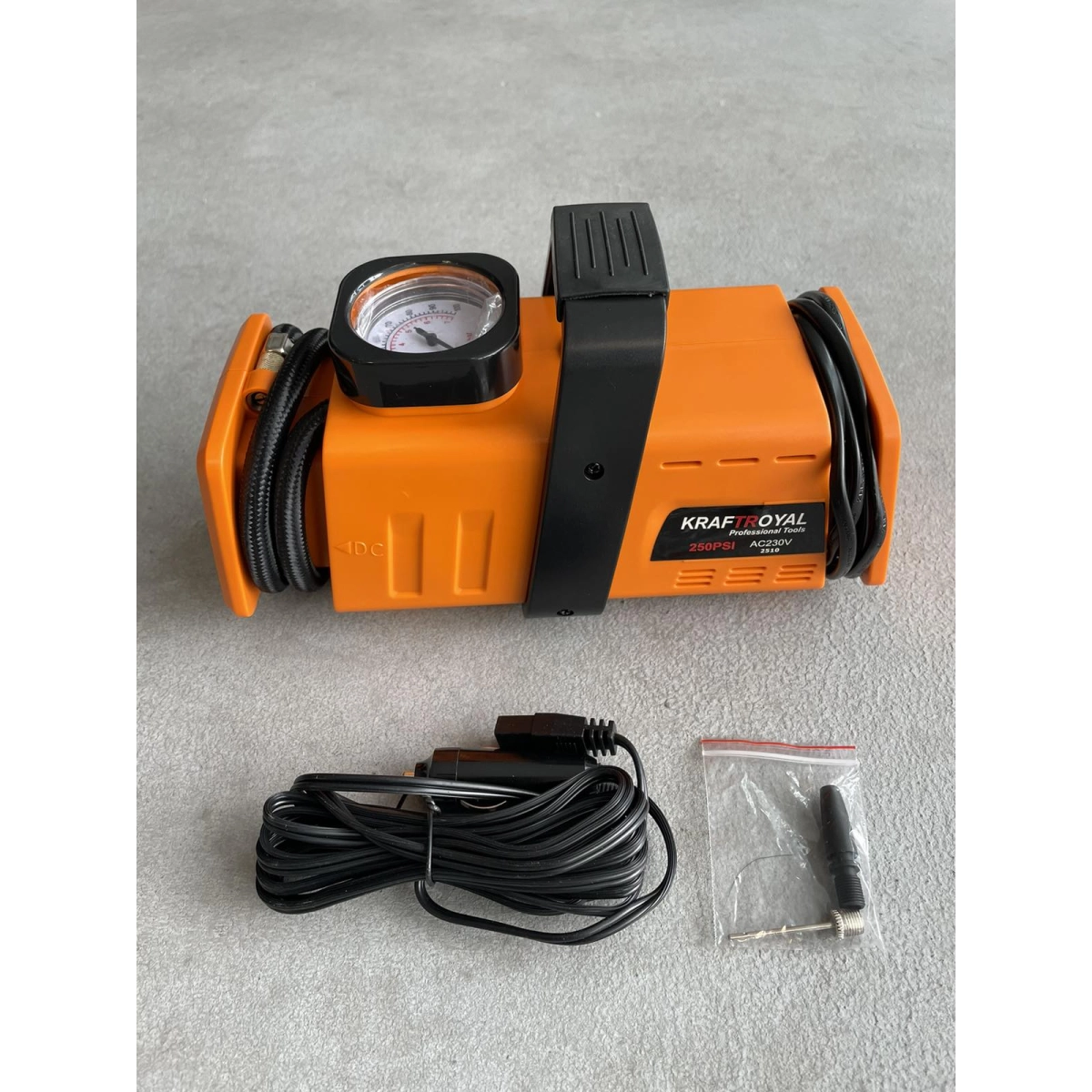 Компресор за гуми KraftRoyal 7 Bar с 12V и 220V захранване е практично и надеждно устройство, предназначено за бързо и ефективно надуване на автомобилни гуми и различни спортни уреди. Благодарение на възможността за работа както от автомобилната запалка, така и от стандартен електрически контакт, този компресор е отличен избор за всеки водач, който търси удобство и гъвкавост в едно.