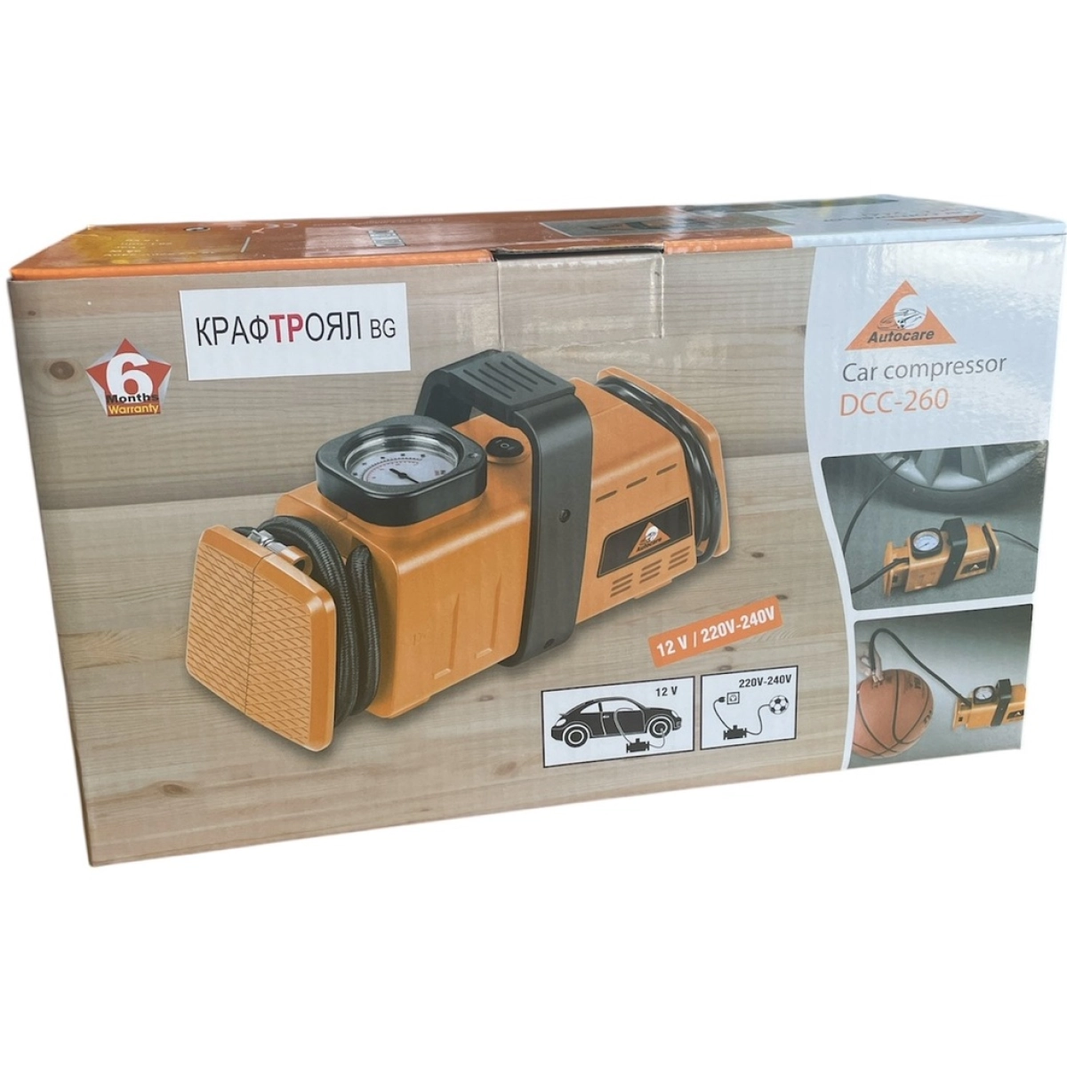 Компресор за гуми KraftRoyal с двойно захранване 7 Bar Компресор за гуми KraftRoyal 7 Bar с 12V и 220V захранване е практично и надеждно устройство, предназначено за бързо и ефективно надуване на автомобилни гуми и различни спортни уреди. Благодарение на възможността за работа както от автомобилната запалка, така и от стандартен електрически контакт, този компресор е отличен избор за всеки водач, който търси удобство и гъвкавост в едно. Основни характеристики Максимално налягане 7 Bar – осигурява достатъчно сила за надуване на гуми на леки автомобили, джипове и велосипеди. Двойно захранване 12V и 220V – позволява използване както на пътя, така и у дома или в сервиз. Компактен и лек дизайн – лесен за пренасяне и съхранение, пасва в багажника или в кутията за инструменти. Антивибрационни крачета – гарантират стабилност по време на работа и намаляват шума. Многофункционални накрайници – подходящи за надуване на спортни топки, дюшеци, велосипеди и други надуваеми изделия. Приложение Този компресор е идеален за поддържане на правилното налягане в автомобилните гуми, което подобрява безопасността на пътя и икономията на гориво. Освен това е подходящ за бързо надуване на спортни аксесоари като топки за футбол, баскетбол, дюшеци за плаж и къмпинг, както и велосипедни гуми. Универсалната му функционалност го прави незаменим помощник както за шофьори, така и за любители на активния начин на живот. Защо да изберете този продукт Компресорът за гуми KraftRoyal се отличава с висока надеждност и удобство при употреба. Възможността за захранване от два източника го прави изключително гъвкав, а здравата конструкция гарантира дълъг живот на устройството. Лесният контрол и бързото постигане на желаното налягане ви спестяват време и усилия. Това е перфектното решение за всеки, който иска да поддържа оптимално налягане в гумите си без излишни затруднения. Не пропускайте възможността да се сдобиете с качествен и надежден компресор за гуми KraftRoyal 7 Bar с 12V и 220V захранване, който ще ви служи вярно при всяко пътуване и спортно занимание. Поръчайте сега и се подсигурете за безопасност и комфорт на пътя!