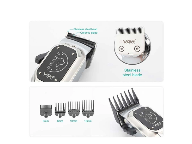 Първокласна машинка за подстригване на домашни любимци с усъвършенствана технология и висококачествени компоненти, за да осигури гладко и ефективно подстригване.Професионални остриета: Оборудвана с керамичен нож и глава от неръждаема стомана, тази машинка за подстригване осигурява прецизно и гладко подстригване, без да уврежда козината на Вашият домашен любимец.Ергономичният дизайн и лекотата я правят лесна за работа, намалявайки умората на ръцете по време на продължителни сесии за подстригване.Спецификации:Цвят: СреброБатерия: 2000mAh литиева батерияВреме за зареждане: 3 часаВреме на работа: 200 минутиЗахранване: 5V –1AМаксимални обороти в минута: 6500rpmКакво е включено:VGR V-201 машинка4бр. приставки (3 мм, 6 мм, 10 мм, 13 мм)Защитна капачкаМасло за смазванеЧетка за почистванеUSB кабел за зареждане