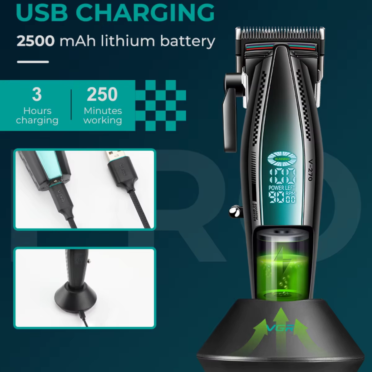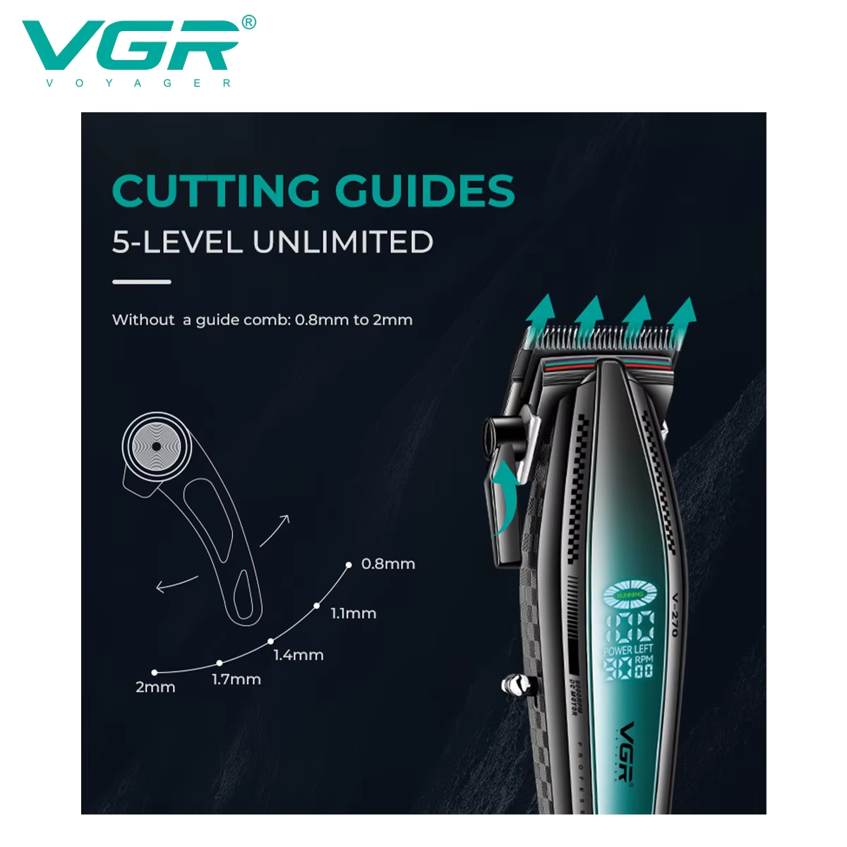 Машинката за подстригване VGR V-270 е перфектното решение за всеки, който търси съчетание между мощност, прецизност и удобство. Този модел предлага високоскоростен мотор и интелигентен LED дисплей, които гарантират безпроблемна и ефективна работа. Със своята дълготрайна батерия и зарядна стойка, VGR V-270 е идеален както за професионални фризьори, така и за домашна употреба.