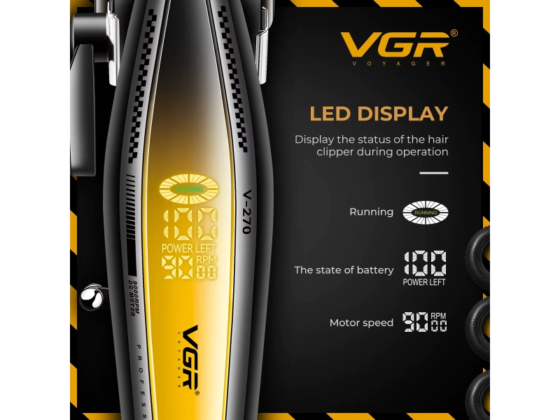 VGR V-270 Машинка за подстригване | LED дисплей, 9000 об/мин, USB-C, стойка