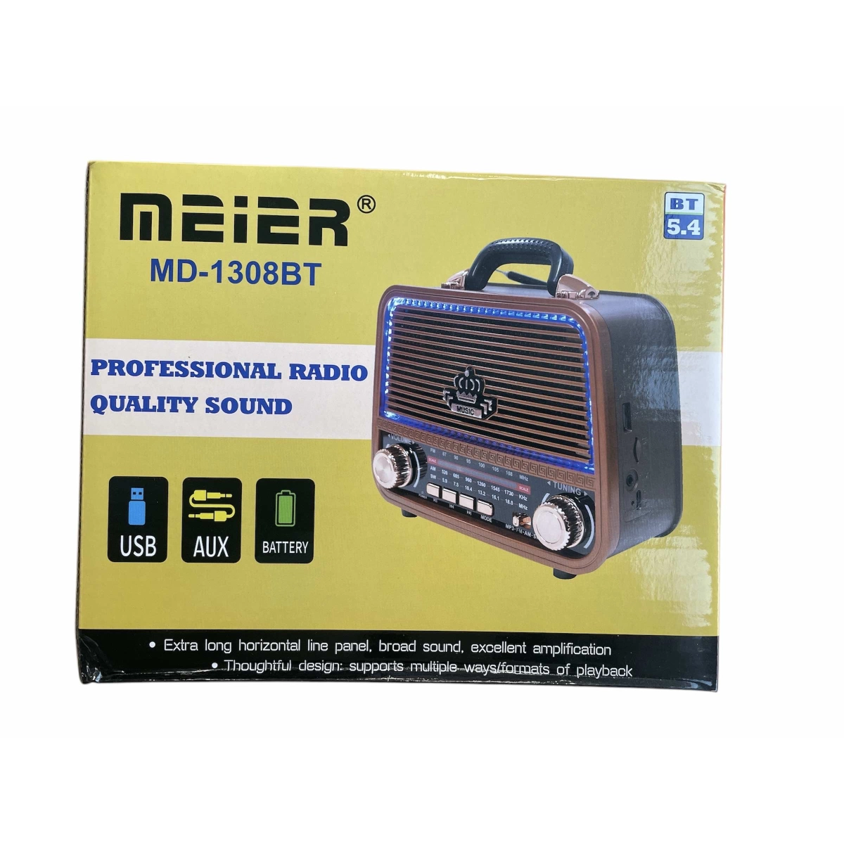 MEIER MD-1308bt ретро радио с Bluetooth и MP3 плейър за автентично звучене MEIER MD-1308bt е стилно ретро радио, което съчетава класически винтидж дизайн с модерни аудио технологии като Bluetooth свързаност и възпроизвеждане на MP3 файлове. Това устройство е идеално за всеки, който търси функционалност и елегантност в едно, позволявайки ви да слушате любимата си музика по различни начини – от FM и AM радио до USB и SD карта. Основни характеристики на MEIER MD-1308bt Ретро винтидж дизайн – естетика, вдъхновена от класическите радиа, която добавя уют и стил във всяко помещение. Bluetooth технология – безжично свързване с телефони, таблети и други устройства за лесно стриймване на музика. FM/AM радио приемник – слушайте разнообразни радиостанции с чист и ясен звук. MP3 плейър – поддръжка на MP3 файлове чрез USB порт и SD карта за максимално удобство и гъвкавост. Висококачествен звук – оптимизирана аудио система за плътно и мощно възпроизвеждане на музика и радио предавания. Лесно управление – интуитивни бутони и контролер за бърз достъп до функции и настройки. Приложение и използване на MEIER MD-1308bt Това ретро радио е подходящо както за домашна употреба, така и за офис или кафене, където желаете да създадете уютна атмосфера с качествен звук и стилен дизайн. Свържете устройството към смартфон чрез Bluetooth за безжично слушане или използвайте USB/SD карта, за да възпроизвеждате любимите си MP3 песни. FM и AM радиото пък ви предоставя достъп до местни и национални радиостанции, което го прави универсално и практично решение за всякакви нужди. Защо да изберете MEIER MD-1308bt ретро радио Избирайки MEIER MD-1308bt, вие получавате не просто функционален аудио уред, а и стилен акцент за интериора си. Комбинацията от класически дизайн и съвременни технологии го прави отличен подарък за любителите на винтидж стил и качествен звук. Това радио предлага много начини за слушане на музика – безжично чрез Bluetooth, с физически носители или чрез радиоефира. Поръчайте сега MEIER MD-1308bt и се насладете на перфектната комбинация от ретро стил и модерна функционалност, която ще обогати всяко музикално изживяване!