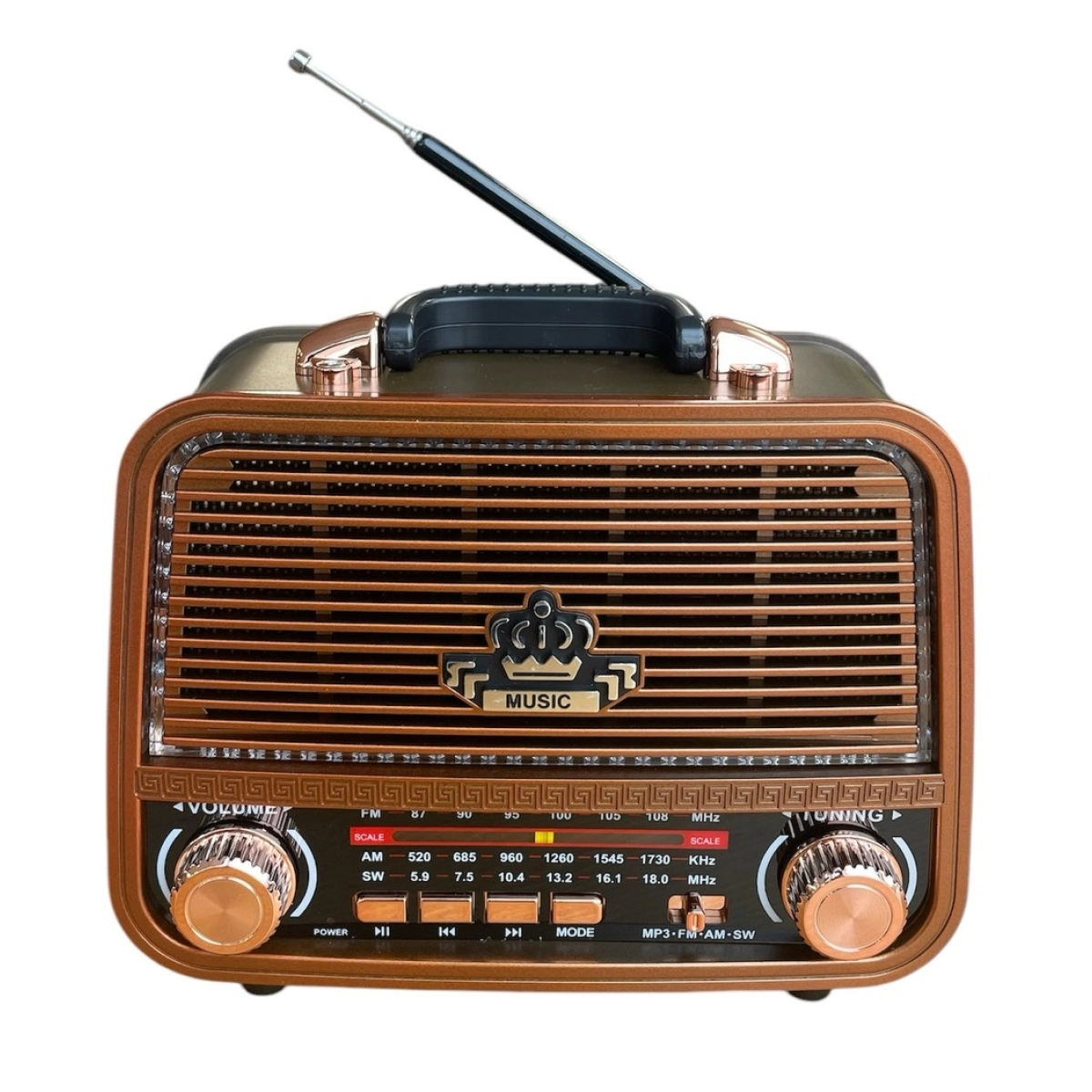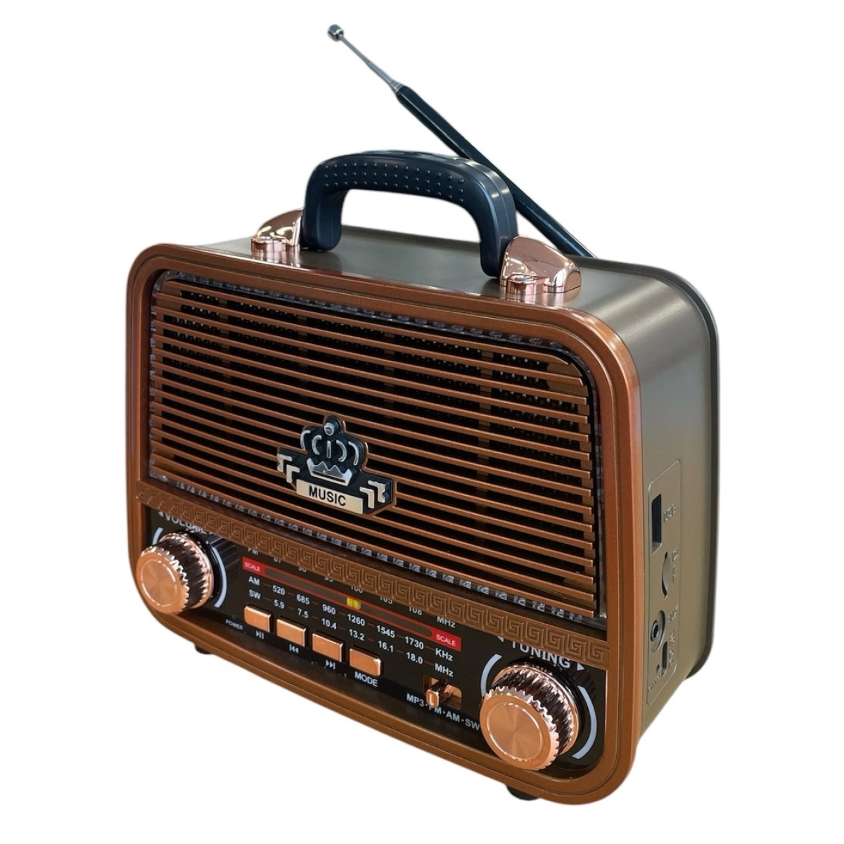 MEIER MD-1308bt е стилно ретро радио, което съчетава класически винтидж дизайн с модерни аудио технологии като Bluetooth свързаност и възпроизвеждане на MP3 файлове. Това устройство е идеално за всеки, който търси функционалност и елегантност в едно, позволявайки ви да слушате любимата си музика по различни начини – от FM и AM радио до USB и SD карта.