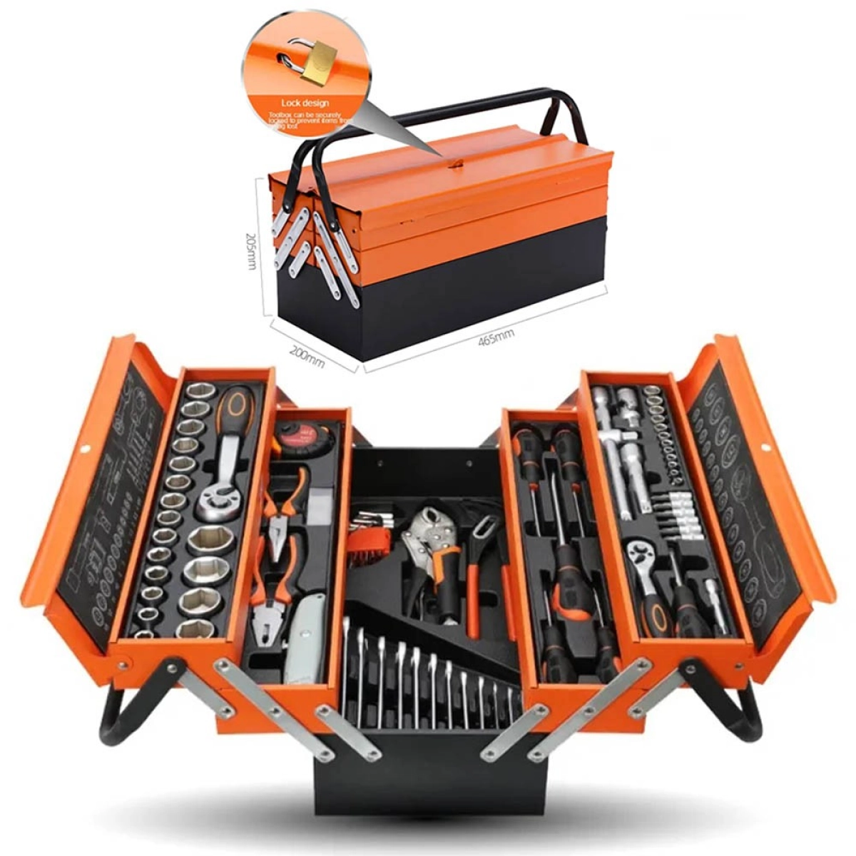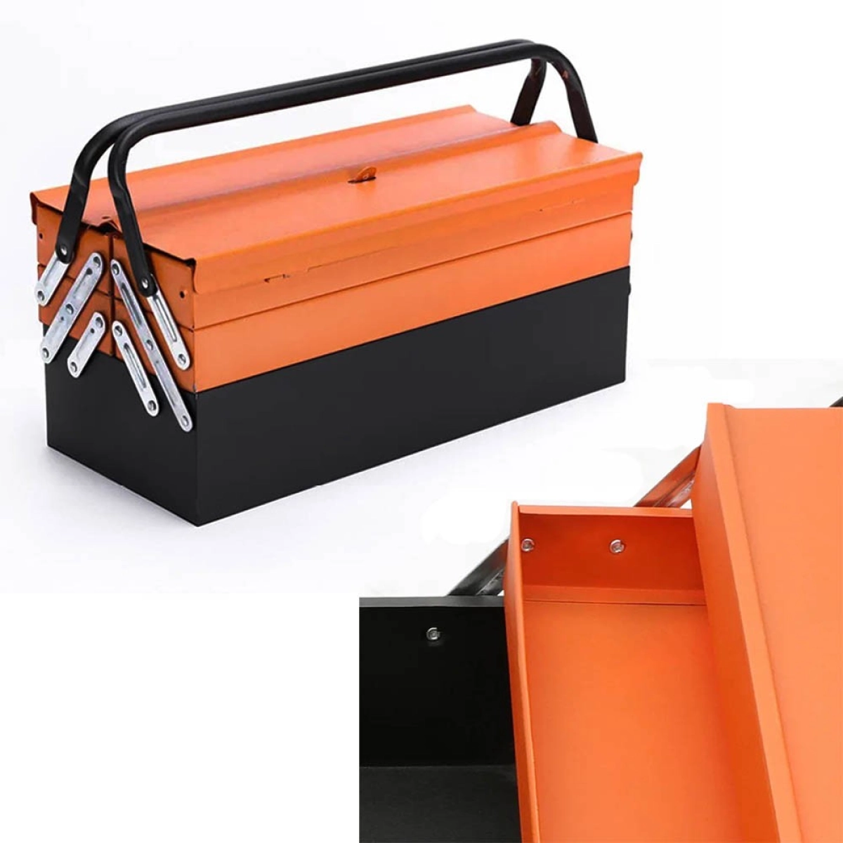 - Здрава метална кутия с удобен сгъваем дизайн, осигуряваща лесен достъп и надеждна защита на инструментите при съхранение и транспорт.