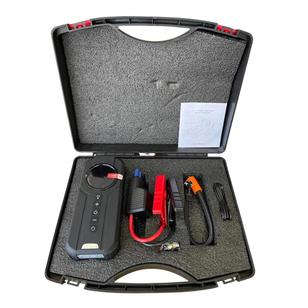 - Вграден компресор за гуми: Позволява лесно и бързо напомпване на автомобилни и велосипедни гуми с максимално налягане до 150 PSI, без нужда от допълнително оборудване.