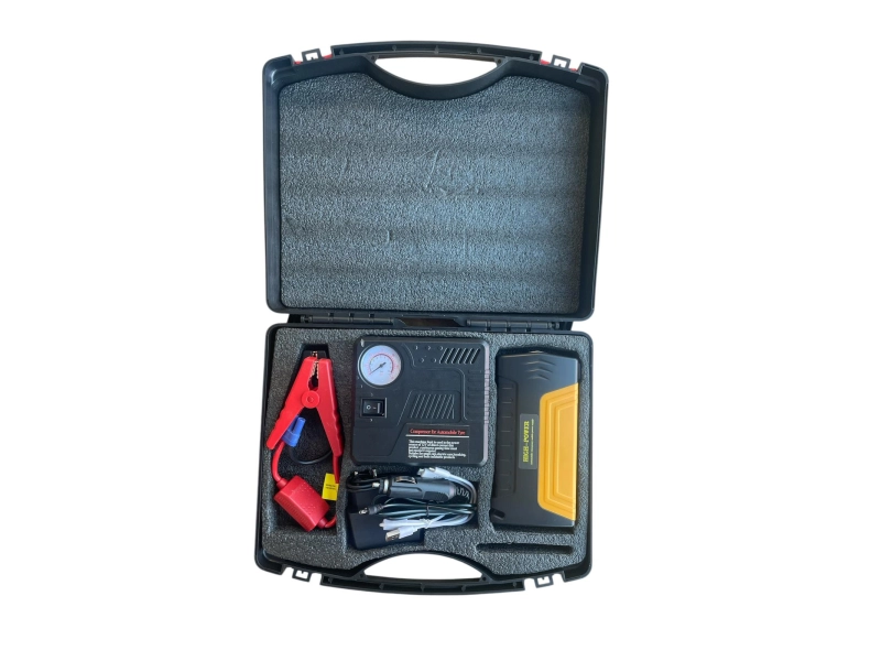 Комплектът служи за стартиране на автомобил с изтощен акумулатор, напомпване на гуми и зареждане на мобилни устройства.