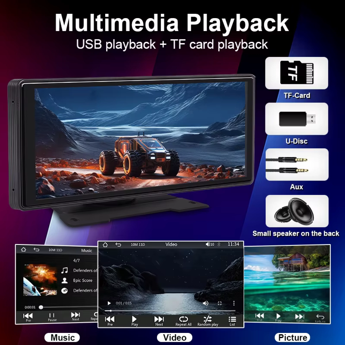 - Вграден MP5 плейър за възпроизвеждане на видео и аудио файлове, включително музика и GPS навигация чрез смартфон.