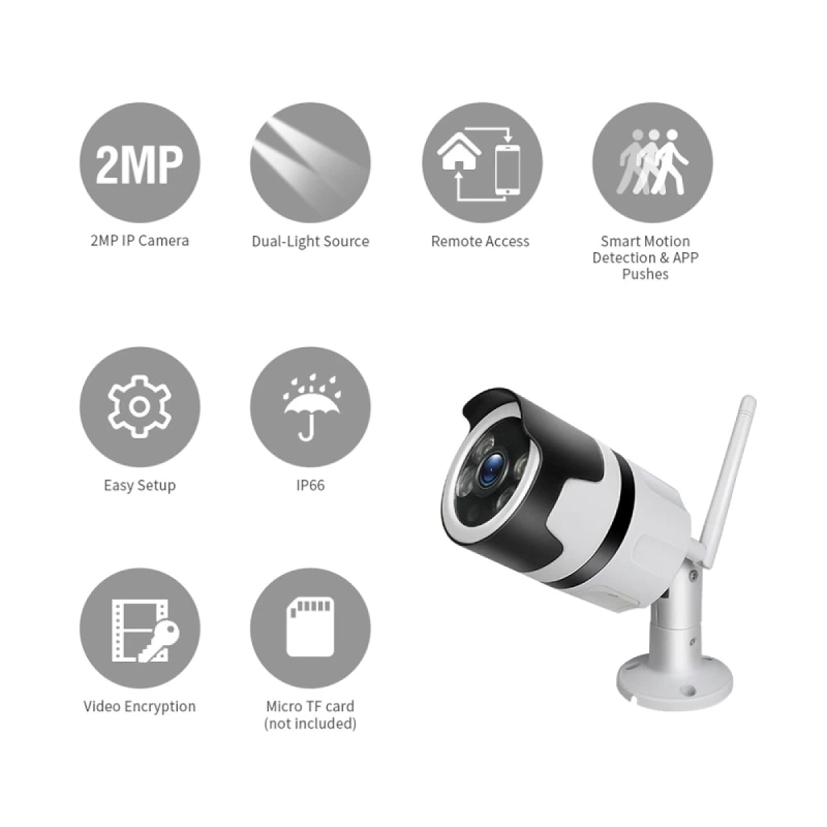 Избирайки този комплект, вие получавате надеждна и лесна за използване система за сигурност, която не изисква сложна инсталация и допълнителни устройства. Високата резолюция и интелигентните функции като детекция на движение и двупосочен звук гарантират, че винаги ще бъдете информирани за случващото се около вашия имот. Освен това, устойчивият на външни влияния корпус и мощните диоди за нощно виждане осигуряват дълготрайна работа и ясна видимост при всякакви условия.