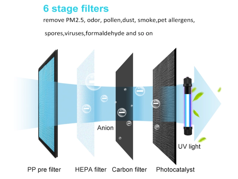 Спецификация:Входно напрежение220V, честота: 50 HZИзходна мощност75WМощност на UV лампата25WДължина на UV тръбатаH тръба 317ММИнтензитет на ултравиолетовата лампа≥50um / cm2Максималната дължина на вълната на ултравиолетовото лъчение 253.7nmАтмосферно налягане86Kpa -106JKraСензор Weisheng от първо поколение (.WS1.)Температура и влажност на работната среда-15 ~ 50°С, влажност: <85%Консумация на енергия в режим на готовност≤0,5W при 220V / 50HZВентилатор220V AC мотор с регулиране на скоростта, мощност ≤130WСензор за частициОткрива PM2.5 с широчинно импулсна модулацияРазмер на продукта360 * 200 * 63OммСветлинната лента автоматично променяща цвета си спрямо качеството на въздуха.Сензорен контролен екран, инфрачервено дистанционно управление.Захранване на четирицветна светлинна лента 12V (12V цветен светлинен светодиод).