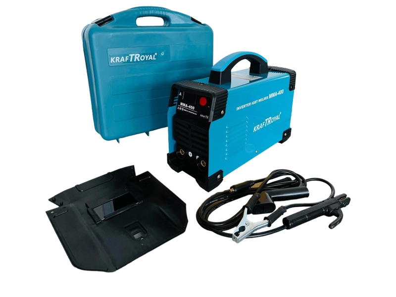Професионален инверторен електрожен KraftRoyal MMA-400A със син куфар за лесно пренасяне. Надежден и мощен. Разгледай офертата!