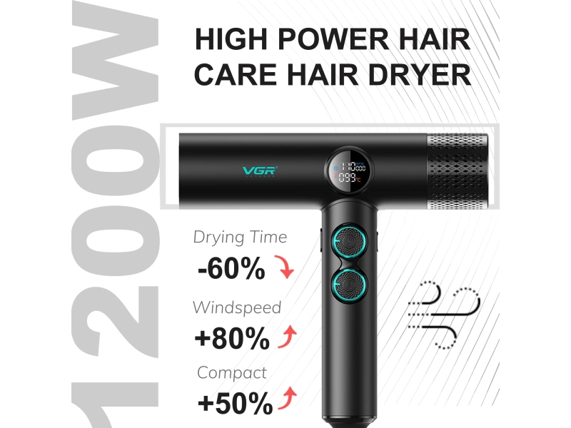 Професионален сешоар черен VGR-401 с отрицателни йони, BLDC мотор за бързо сушене с нисък шум, LED дисплей