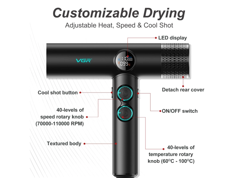 Сешоарът VGR 401 предлага 40 настройки за температура (60-100°C) и 40 скорости (7000-11000 об/мин), които се визуализират на елегантен LED дисплей. Така получавате перфектен контрол за всеки тип коса и всяка желана визия.