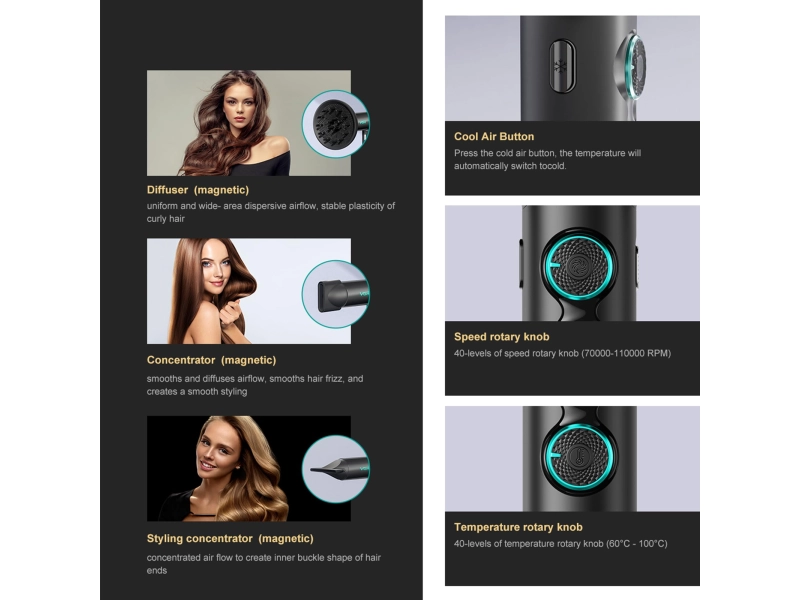 Компактният и лек дизайн с 360° въртящи се магнитни дюзи и дифузер осигурява лесна смяна на приставките и удобство при пътуване. Това го превръща в перфектния избор както за домашна употреба, така и за професионалисти в движение.