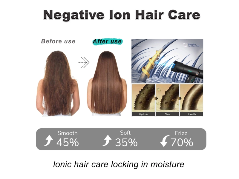 Благодарение на усъвършенстваната система с отрицателни йони, ще се радвате на гладка, мека и жизнена коса без статично електричество и къдрене. Вашата прическа ще изглежда естествено лъскава и здрава всеки ден!